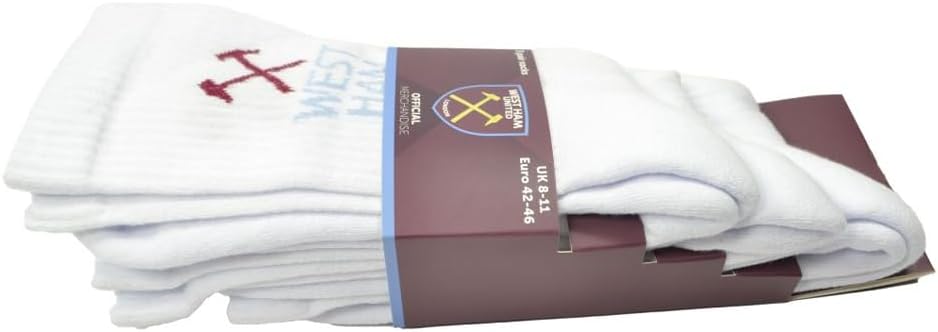 3 PACK WEST HAM UNITED F.C. CREST ADULT WHITE SPORTS SOCKS SHOE SIZE UK ADULT 8-11
