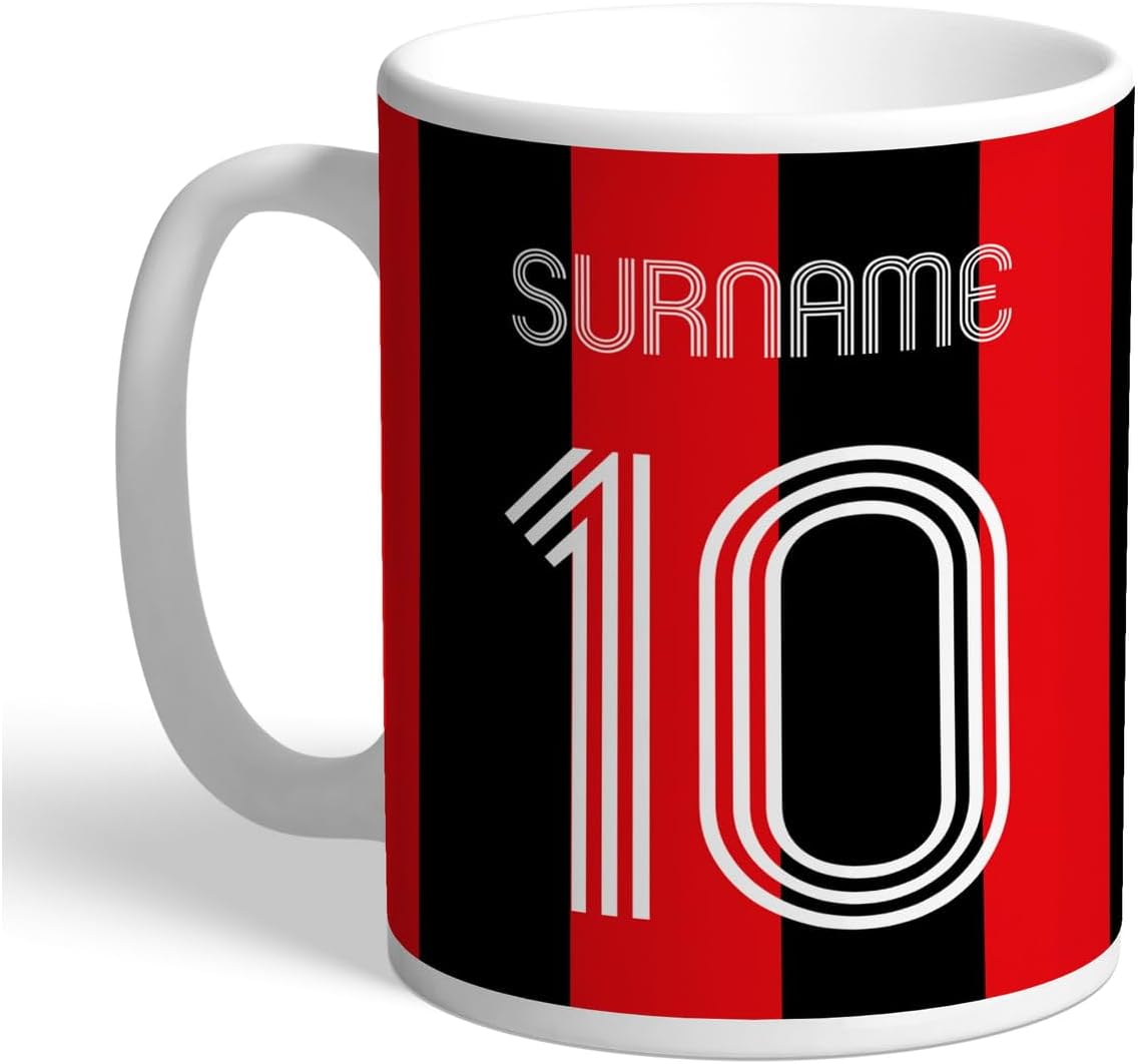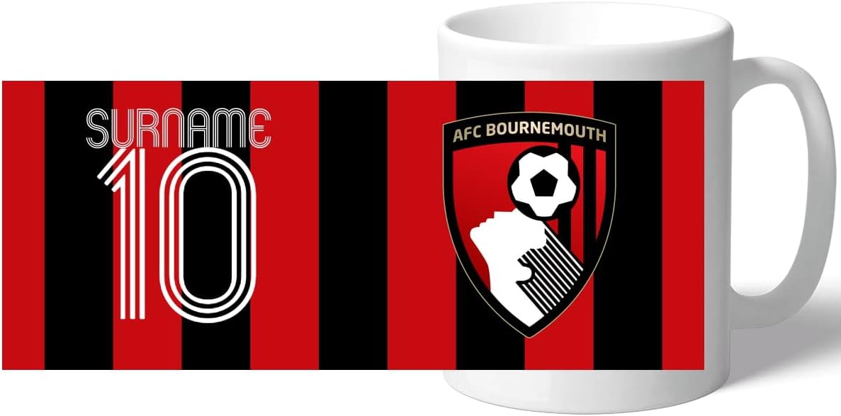This mug intended for AFC Bournemouth fans can be personalised with a name up to 12 characters and number up to 2 digits in retro style font.