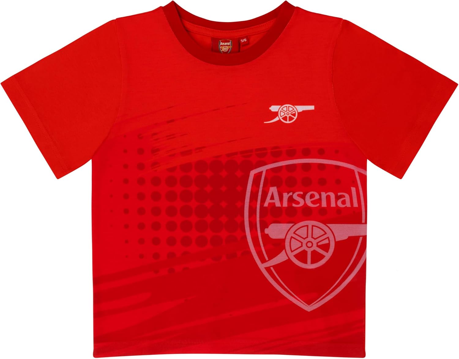 Top: A striking red short-sleeved t-shirt made from 100% polyester on the front for a long-lasting wash-resistant print, featuring the iconic Arsenal crest and a dynamic graphic design that highlights team pride. The back and sleeves are made from soft cotton for comfort.