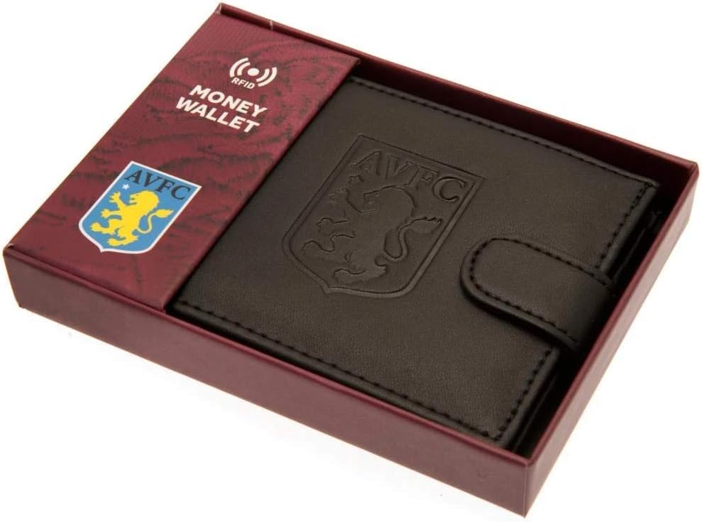Leather wallet with debossed Aston Villa FC crest. RFID anti fraud protection. Multiple card slots. Size (approx): 4.3 x 3.5in. Comes in a gift box. Official licensed product.