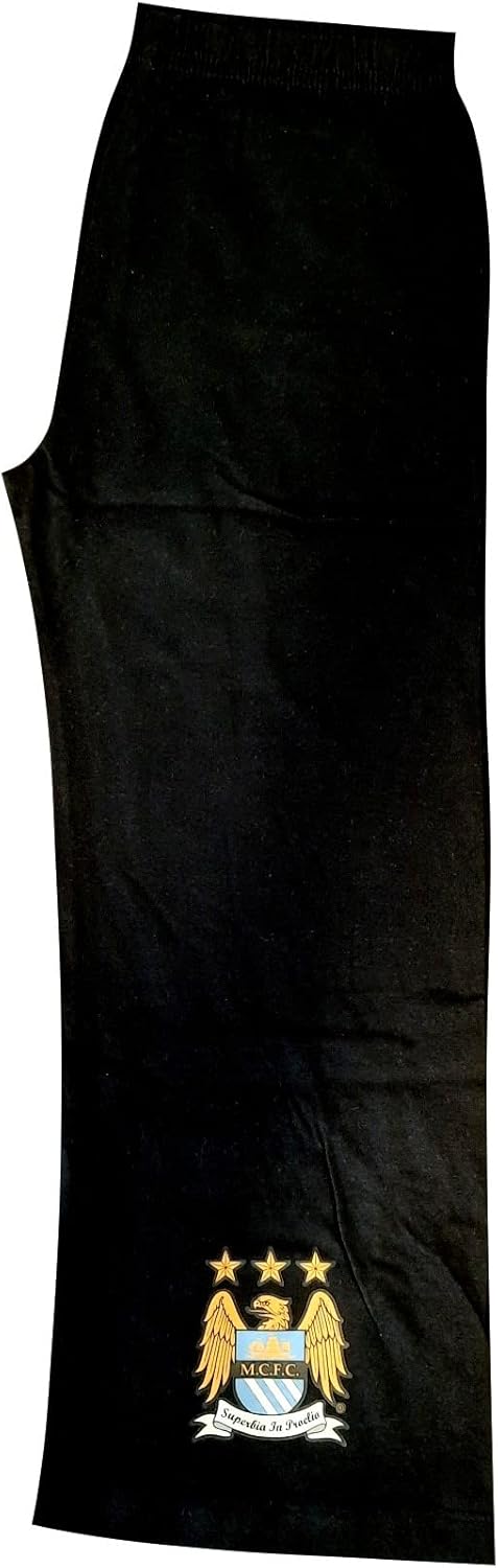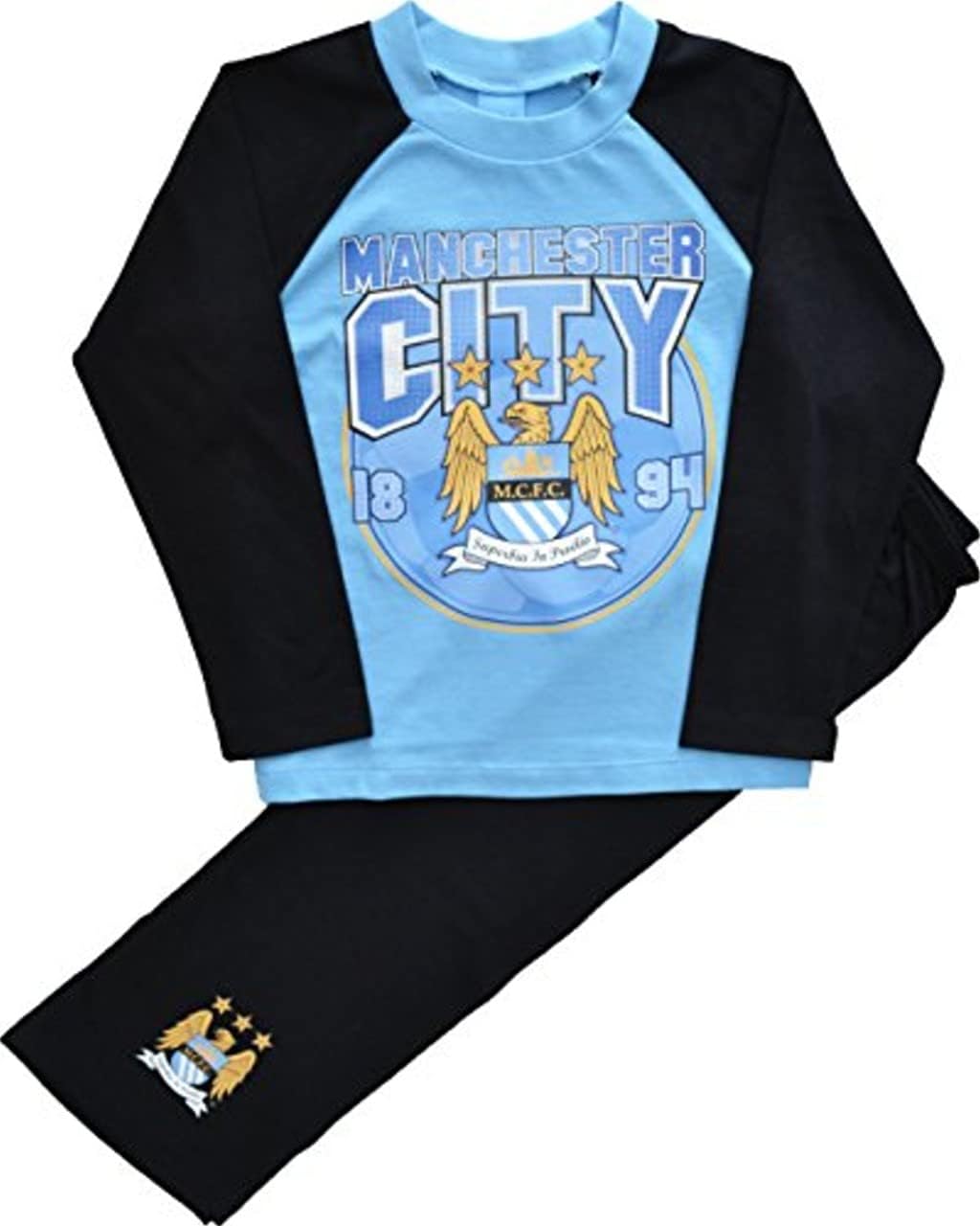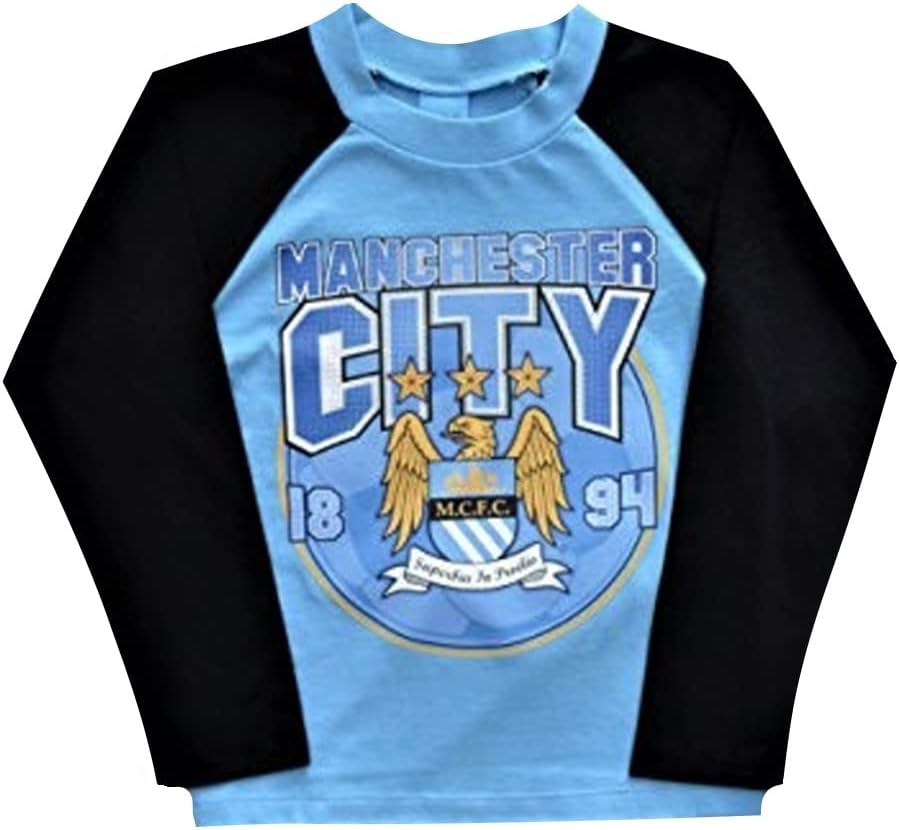 Manchester City Football Club Pyjamas. These Man city F.C. pyjamas have a blue and black long sleeved top and black long wide leg pants. They are made from 100% cotton, Available in ages 4-5 Years (110cm) , 5-6 Years (116cm), Machine Wash DO NOT tumble dry