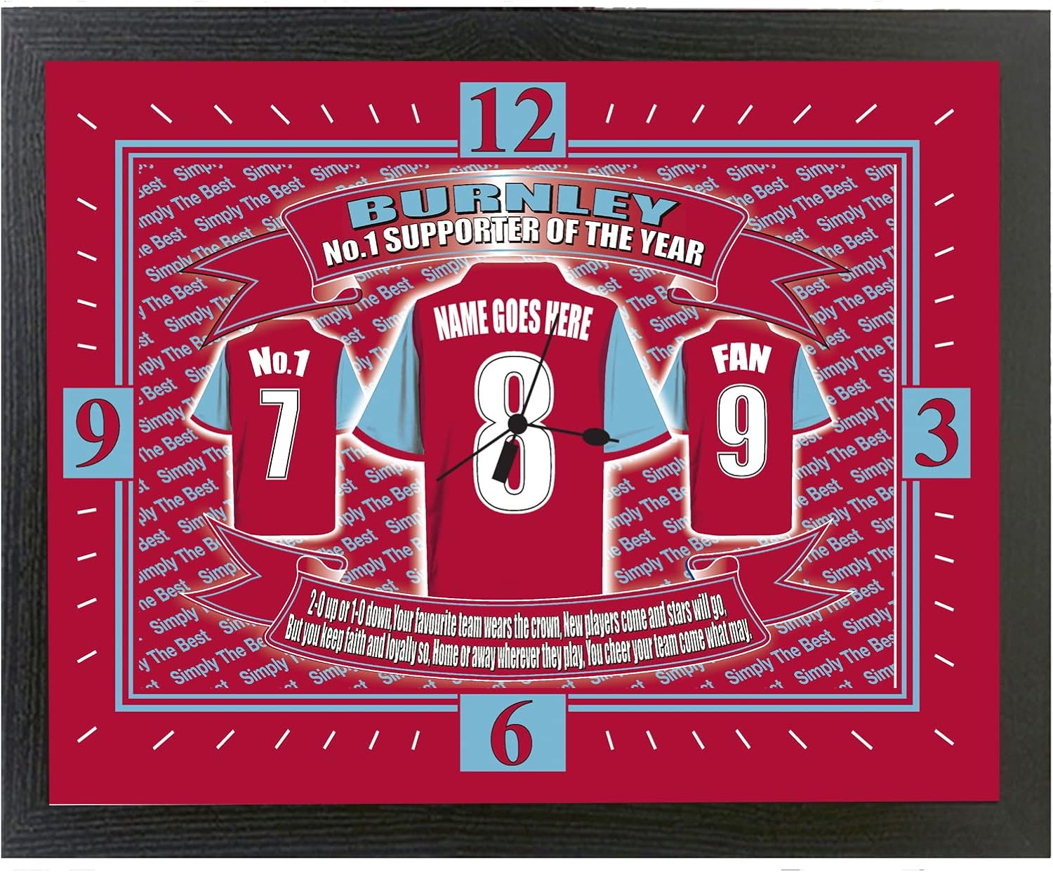 A perfect gift for any avid BURNLEY* fan!! …..this beautiful, mounted clock shows your favourite football team’s shirt. To make this extra special, you can have FREE Personalisation of any name of your choice up to 12 characters, making this an ideal gift for any occasion for someone special……or just treat yourself! Finished frame size: 25cm x 34cm (approximate). Please note: Any image or text displayed on this unofficial product has been independently produced and is in no way connected with, or endorsed by, the personalities, people, agents, or organisations they may appear to depict.