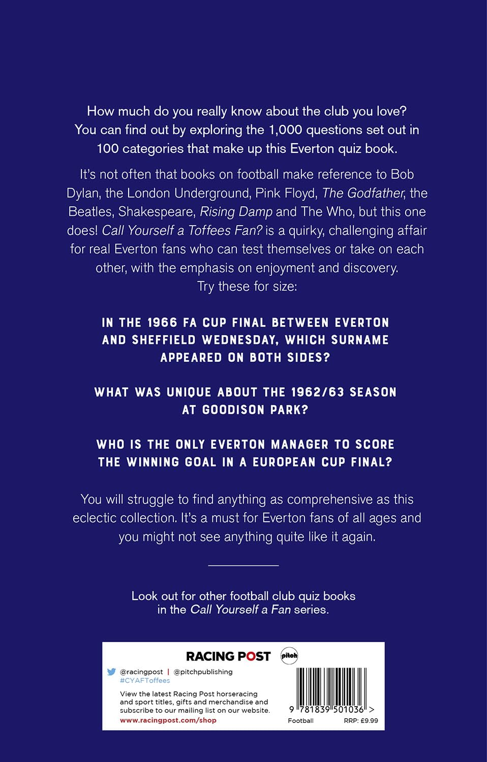 Packed with 1000 questions set out in 100 different categories and designed for maximum enjoyment and discovery, Call Yourself A Toffees Fan? is a quirky quiz book in which fans can test themselves (or each other) and have a great time while doing so.