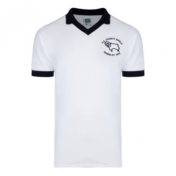 Derby County 1975 Charity Shield Retro Football Shirt Derby played FA Cup holders West Ham United in only the second time the Charity Shield had been staged at Wembley Stadium They went on to win 2-0 with goals from Kevin Hector and Captain Roy McFarland