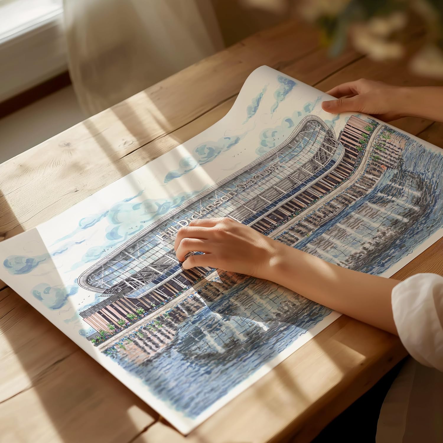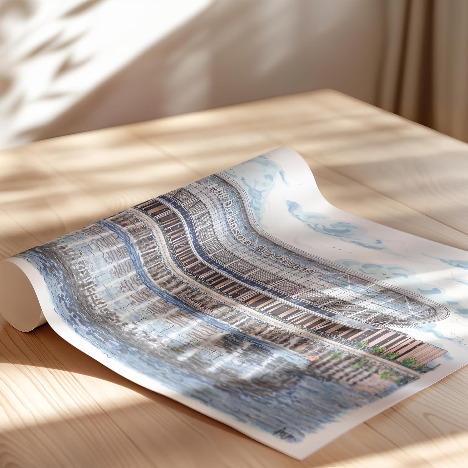 Hand-drawn print of Everton FC new Hill Dickinson Stadium sold unframed. A great gift for any evertonian of the new beautiful stadium at Bramley Moore Docks just opened this season! Sketched in pencils and finished with fine liner pens and pro marker pens.