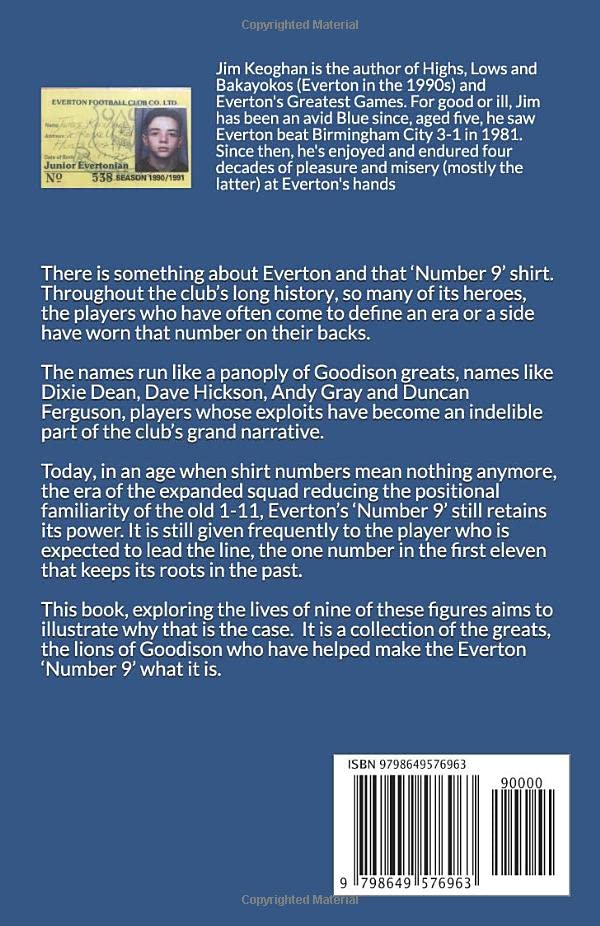 There is something about Everton and that ‘Number 9’ shirt. Throughout the club’s long history, so many of our heroes, the players who have often come to define an era or a side have worn that number on their backs.The names run like a panoply of Goodison greats, names like Dean, Hickson, Gray and Ferguson, players whose exploits have become an indelible part of the club’s grand narrative.It’s telling that today, in an age when shirt numbers mean nothing anymore, the era of the expanded squad reducing the positional familiarity of the old 1-11, Everton’s ‘Number 9’ still retains its power.It is still given frequently to the player who is expected to lead the line, the one number in the first eleven that keeps its roots in the past.This book, exploring the lives of nine of those figures aims to illustrate why that is the case, to show just what they gave to this club. It’s not an exhaustive exploration and nor does it cover everyone who has ever worn that number, but it is a collection of the greats, the lions of Goodison who have helped make the ‘Number 9’ what it is.