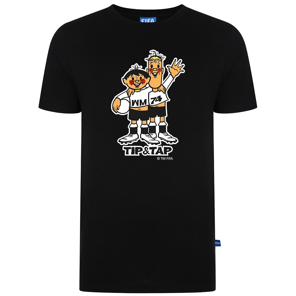 FIFA 1974 Mascot Tee The FIFA Officially Licensed 1974 Mascot Tee. Features the Official mascots of the 1974 World Cup held in West Germany. The mascots were called Tip and Tap and were the first World Cup mascot duo. 100% Cotton.
