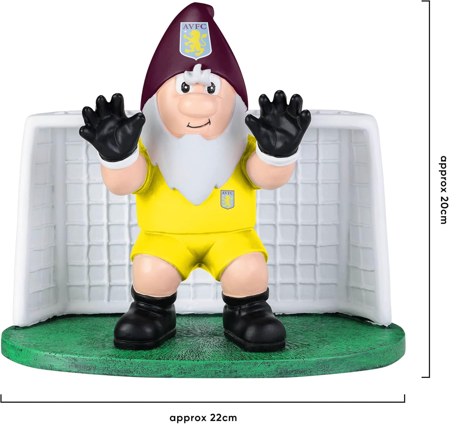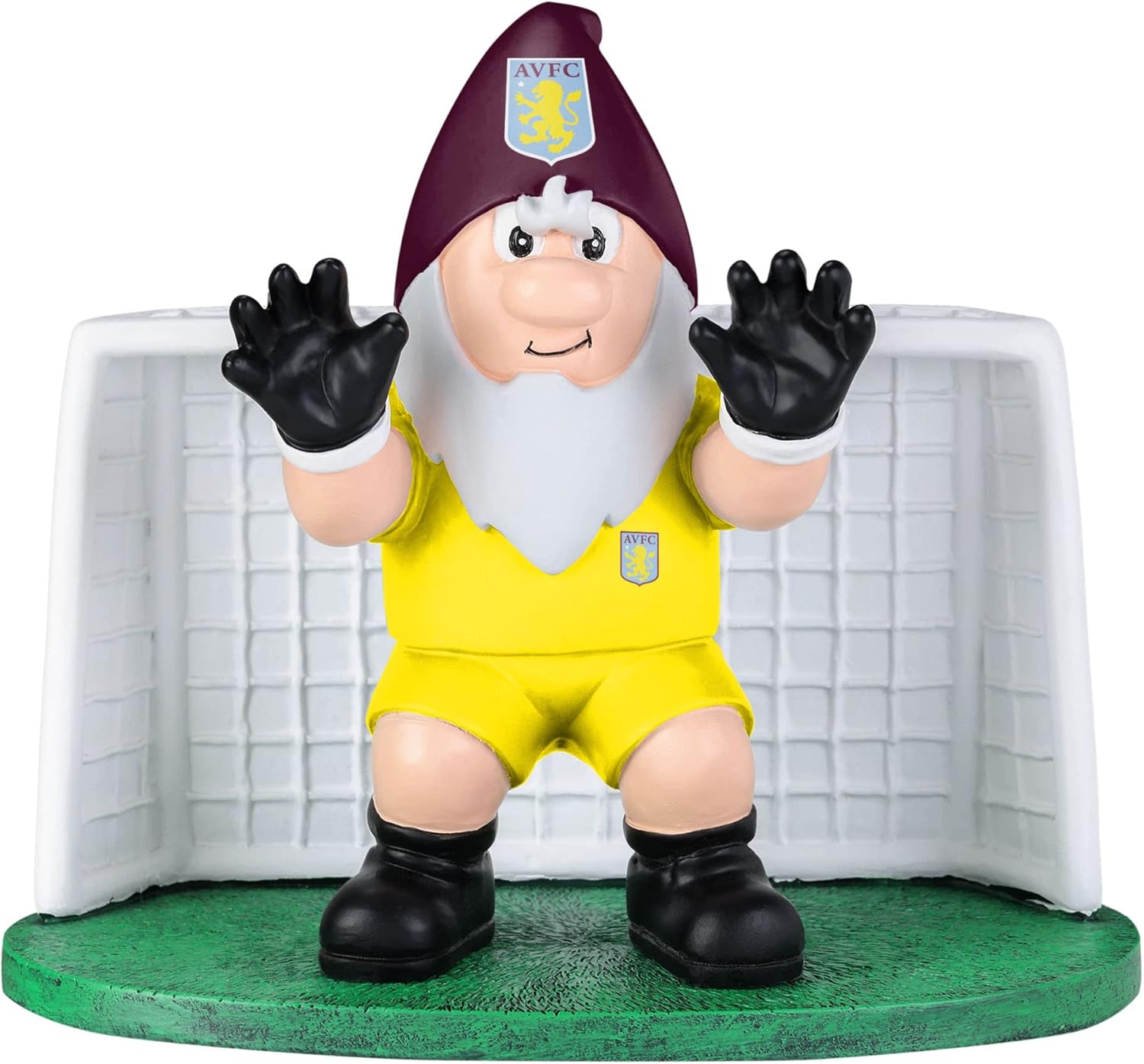 Gnome wearing matchday uniform in a goalkeeping pose Club crest displays on hat and kit