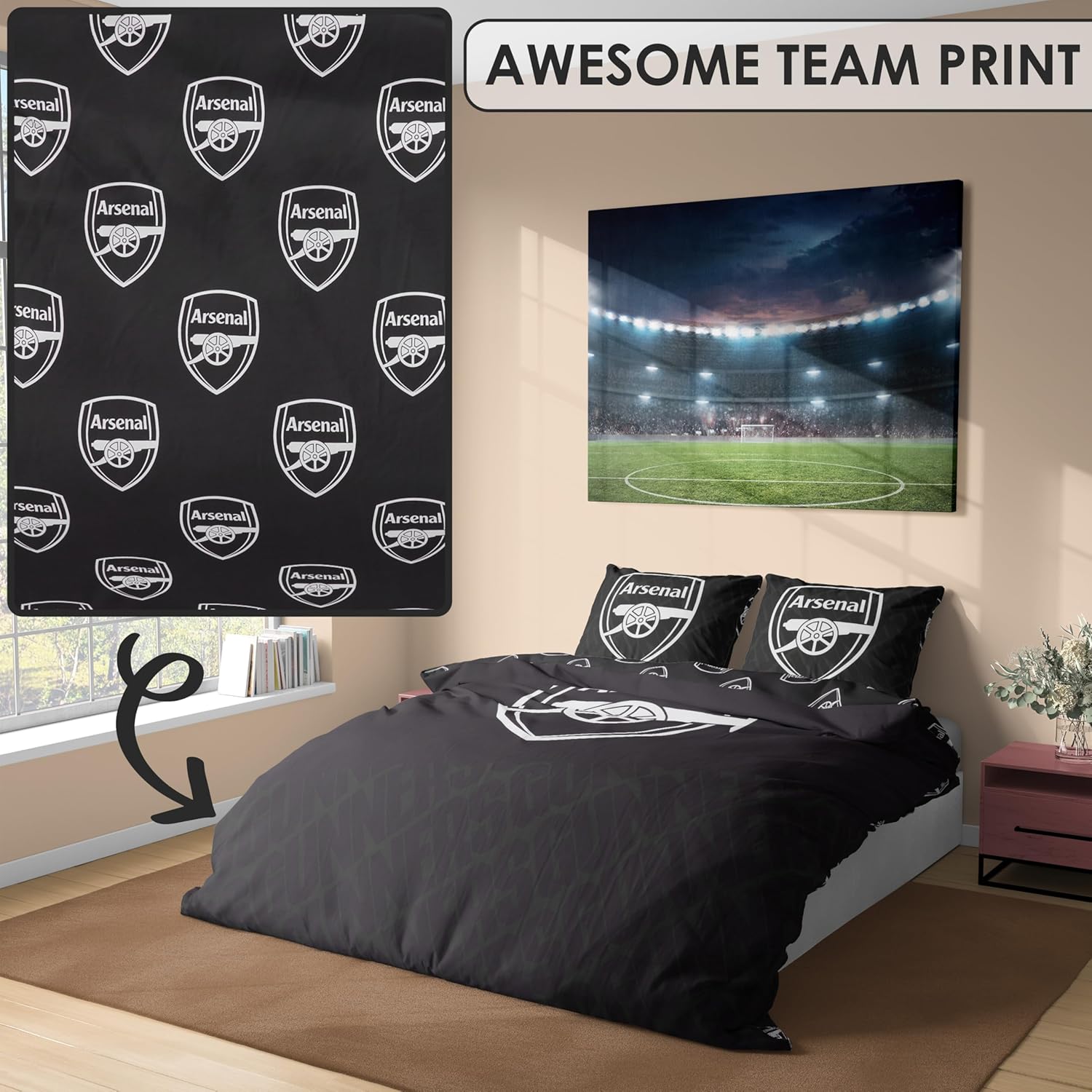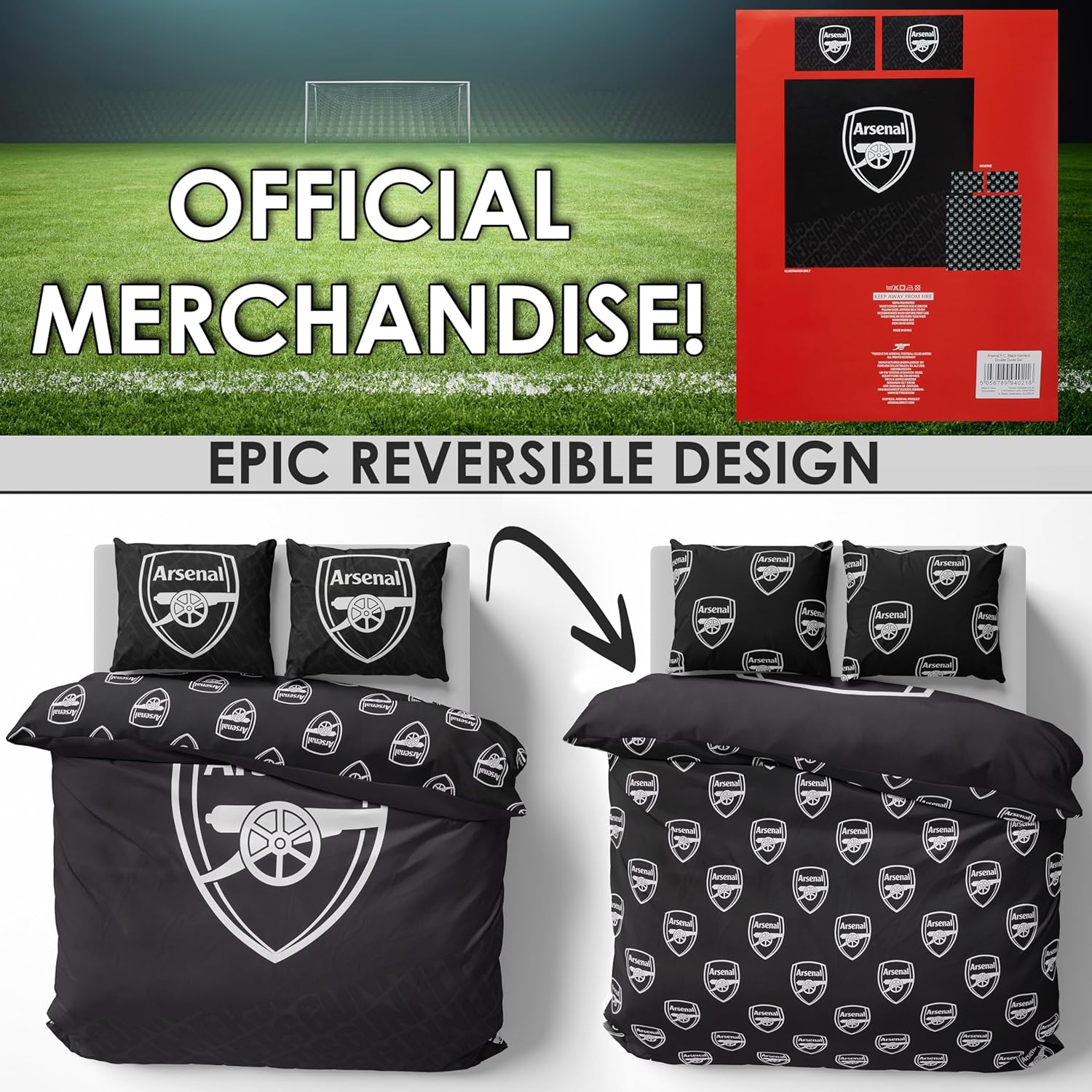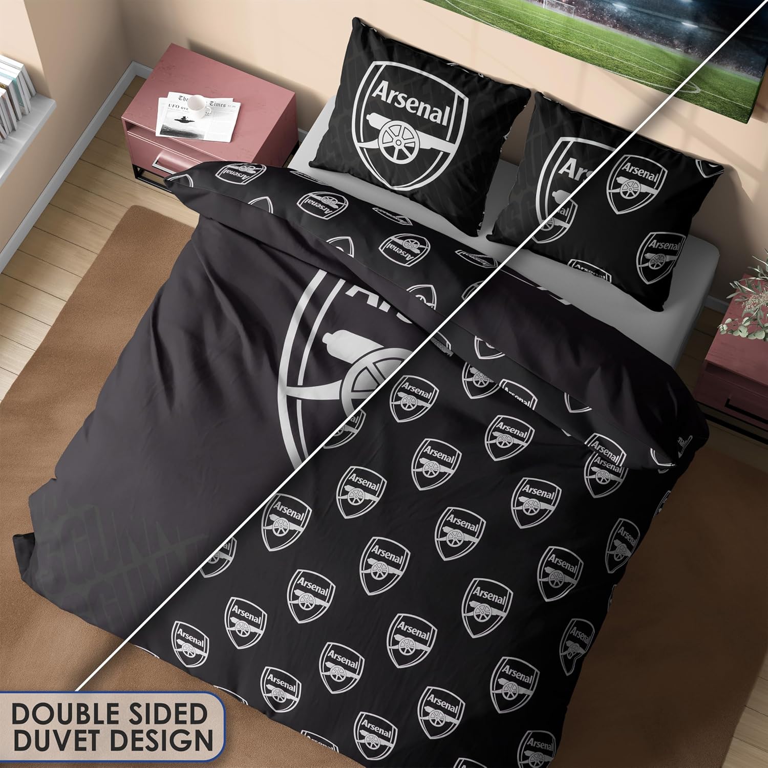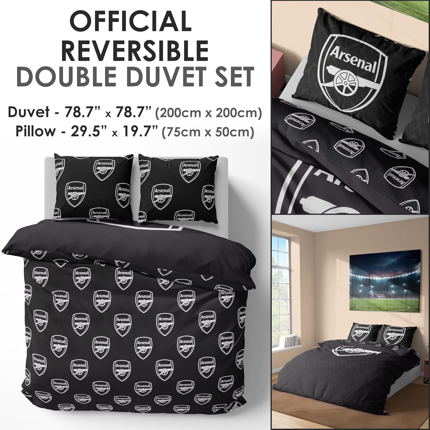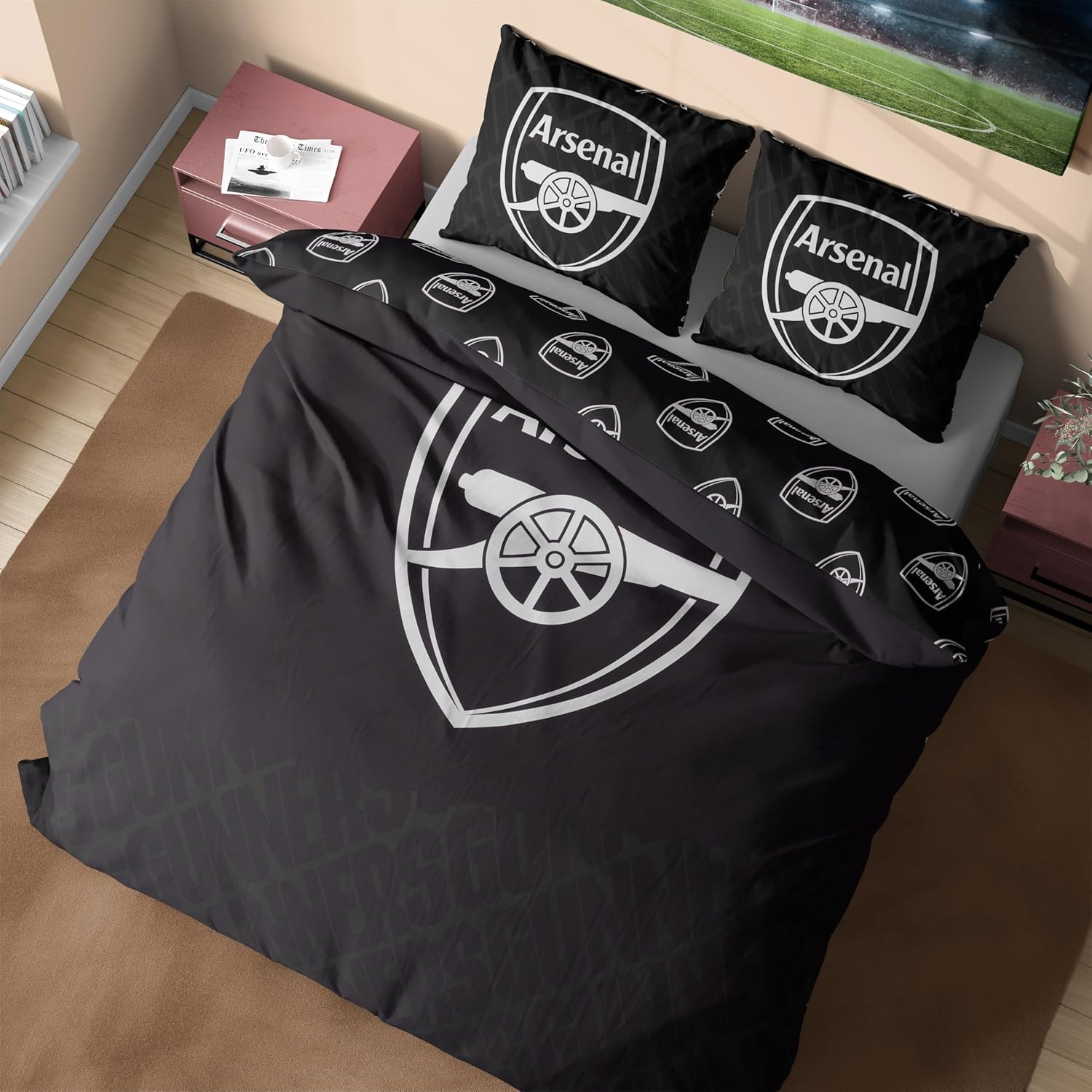 Get Trend Arsenal FC Double Duvet Cover Set, Reversible Football-Themed Bedding Set with 2 Pillowcases, Ultra Soft & Durable Duvet Quilt Bedding Cover (Black Arsenal, Double)
