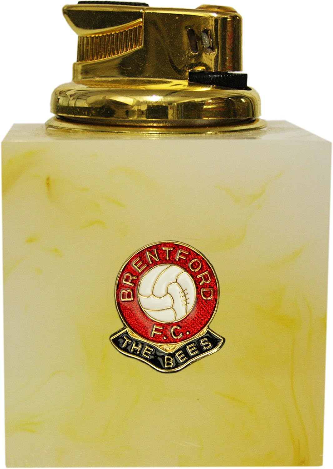 Square table lighter with Brentford football club design enamel badge. Marble effect acrylic base with gas lighter insert. Measures approximately 6cm x 6cm x 6cm. A practical and stylish gift for any football fan with over 90 English and Scottish teams available.