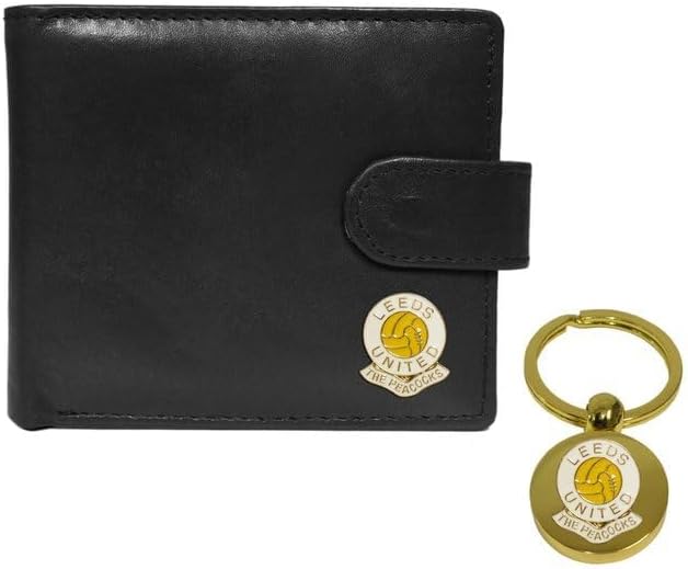 Quality black leather wallet with Leeds United football club design enamel badge. Sections for notes, coins and cards. Secure press stud fastening. Complete with matching 30mm metal gold disc keyring. A stylish and practical gift for any football fan with over 90 English and Scottish teams available.