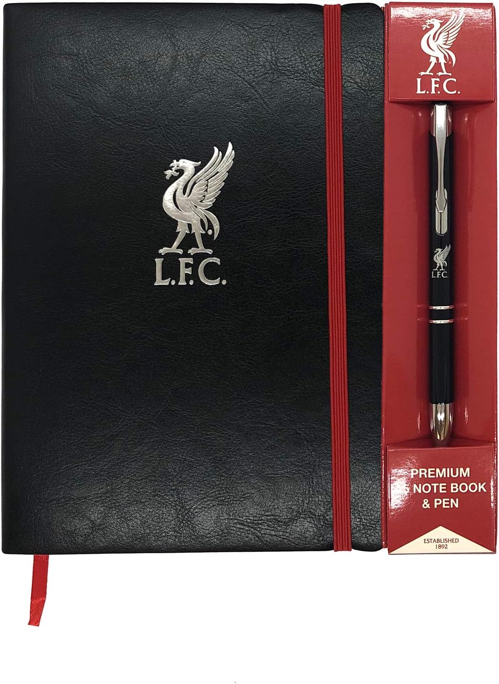 This is then finished off with monochrome silver foil print of the iconic Liver bird logo to the front. Also included is the Liverpool FC branded click pen presented in a branded gift box with black ink.