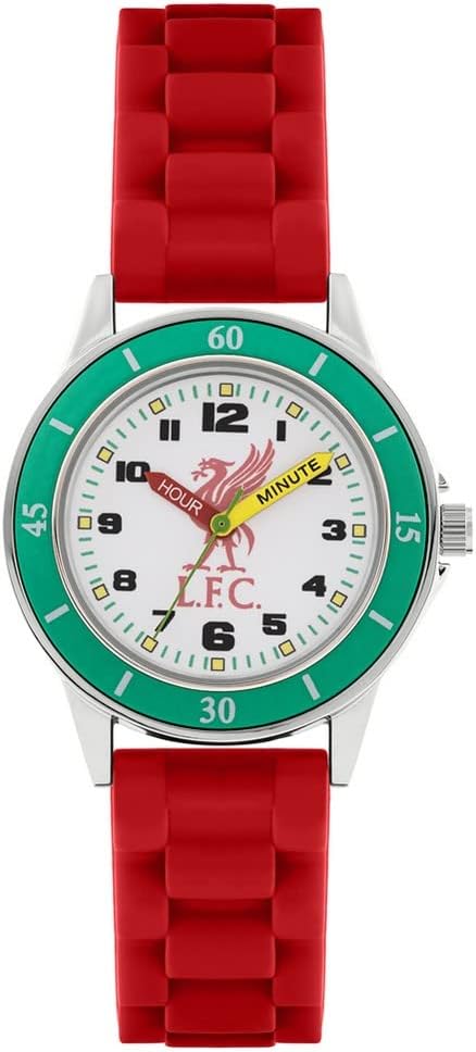 Official Liverpool Football Club watch with printed dial, 3-hand analogue display, time-teaching feature, and red soft silicone strap with traditional buckle fastening. Packaged in official branded packaging and comes with one year guarantee.