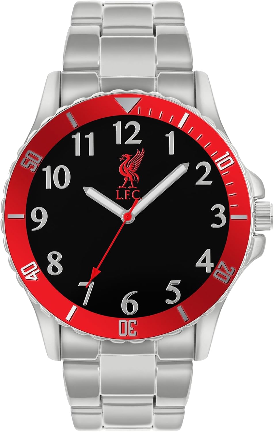 Official Liverpool Football Club Silver Bracelet Watch. Featuring the iconic Liverpool football club logo on a black dial with sleak silver hands, a polished silver stainless steel bracelet strap and red bezel. Packaged in official Liverpool FC packaging and comes with a one year guarantee.
