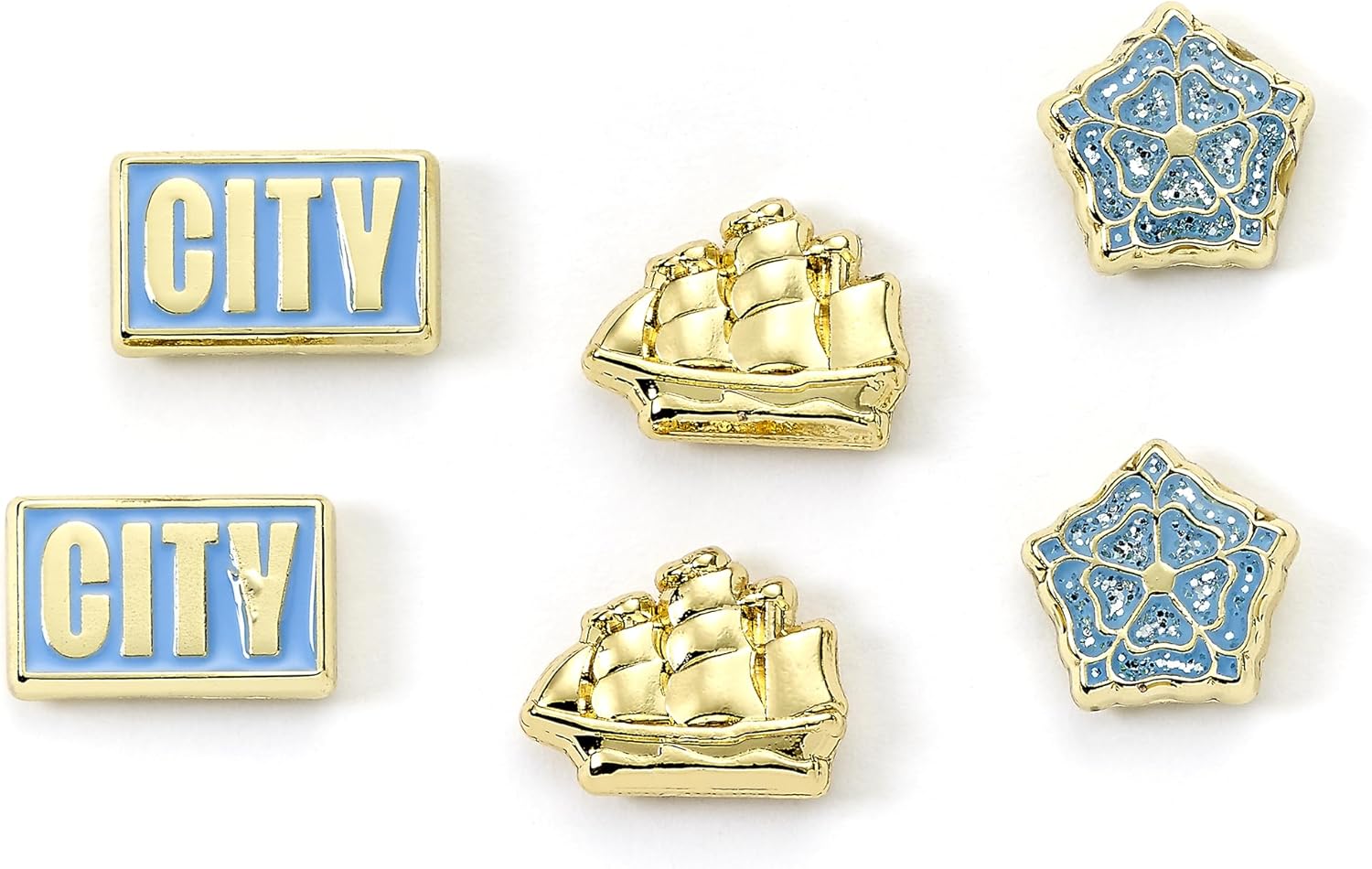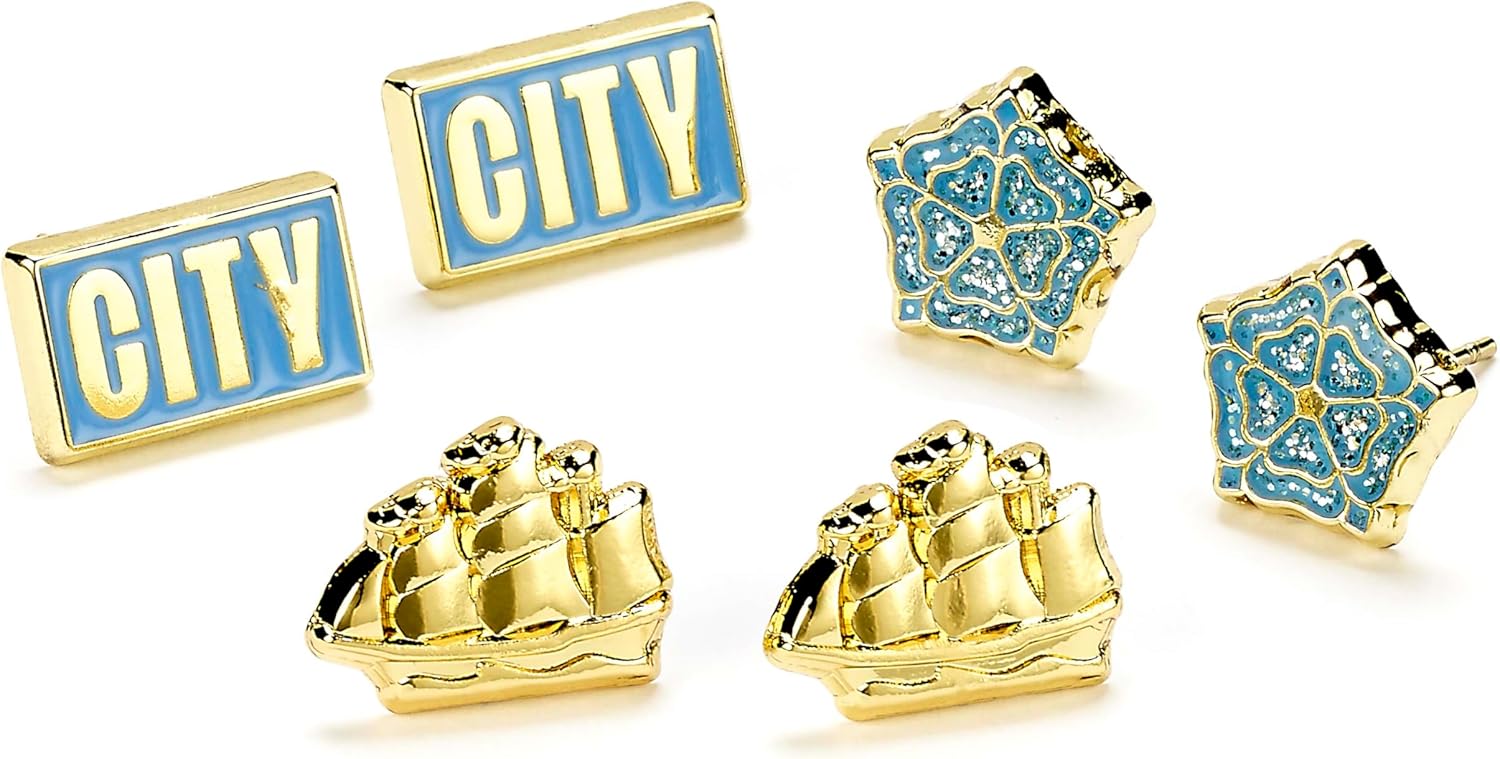 Celebrate your love for Manchester City Football Club with these fabulous stud earrings! Featuring the city logo, ship, and rose, these earrings are part of an officially licensed collection of jewellery and accessories designed for ages 14 and up. Hypoallergenic product which are cadmium, nickel, and lead safe.