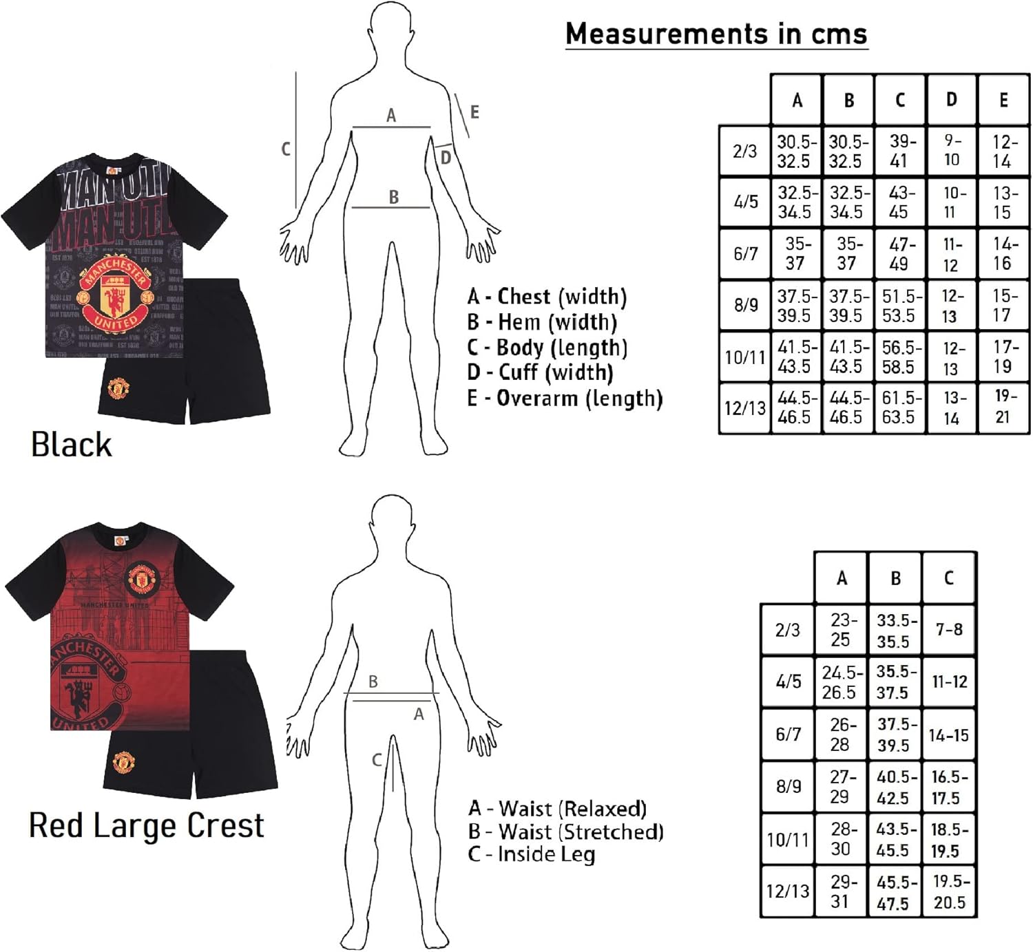 Our Manchester United boy’s pyjama sets are an essential for any young Red Devil. In a selection of colours and styles, these regular fit pyjamas are made from polycotton for a comfortable lightweight feel. An ideal gift for a future Manchester United superstar, the pyjamas feature a short sleeve, pullover t-shirt with a slick Manchester United branded graphic. Also included are pyjama shorts with elasticated waistband and iconic MUFC logo to the left leg. Machine washable. Official MUFC boys short pyjamas Short sleeved top with club crest & text print Black shorts with club crest print; elasticated waist Height: 2-3 yrs 98cm; 4-5 yrs 110cm; 6-7 yrs 122cm; 8-9 yrs 134cm; 10-11 yrs 146cm; 12-13 yrs 158cm