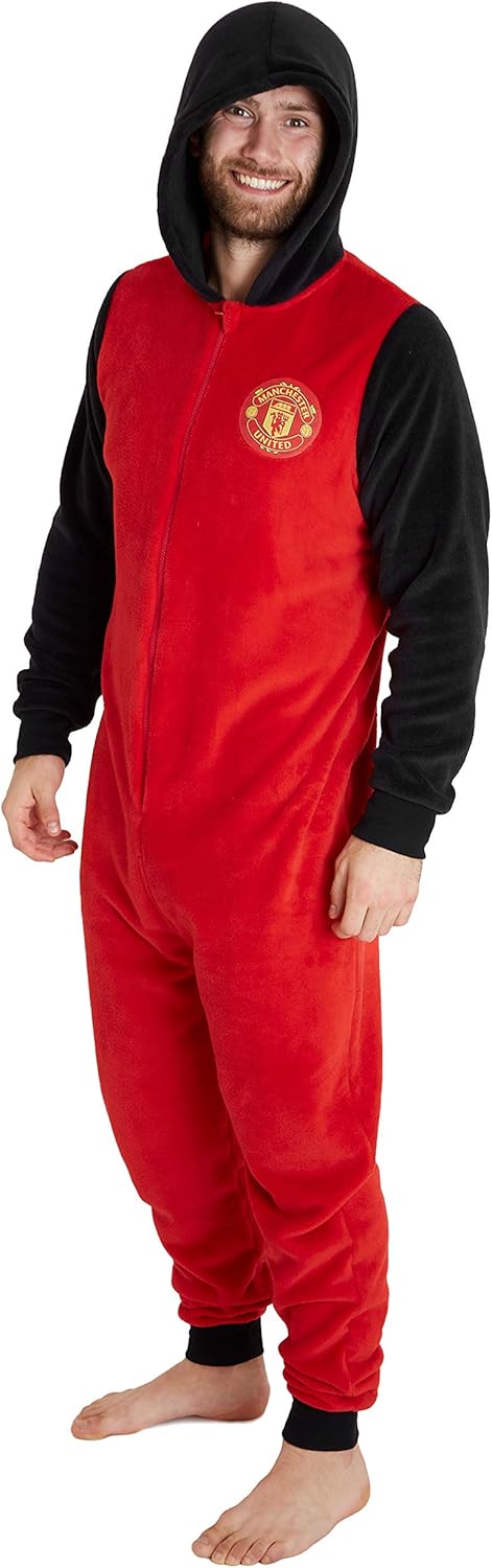 MANCHESTER UNITED ONESIE MEN — These fantastic onesies are ideal as a gift for any Manchester United fan, men, women or teenagers. This super warm sleepsuit features the Manchester United Football club logo and is super comfortable. The onesie comes with long zip at the front, hood and cuffed wrists and ankles to keep the warmth.