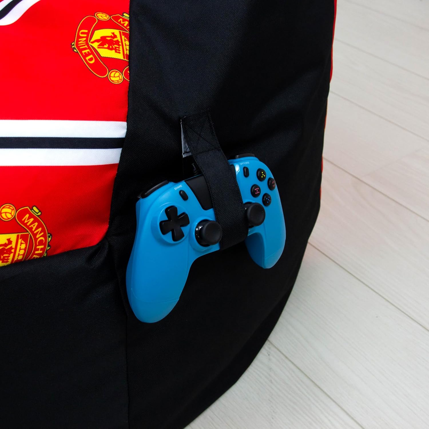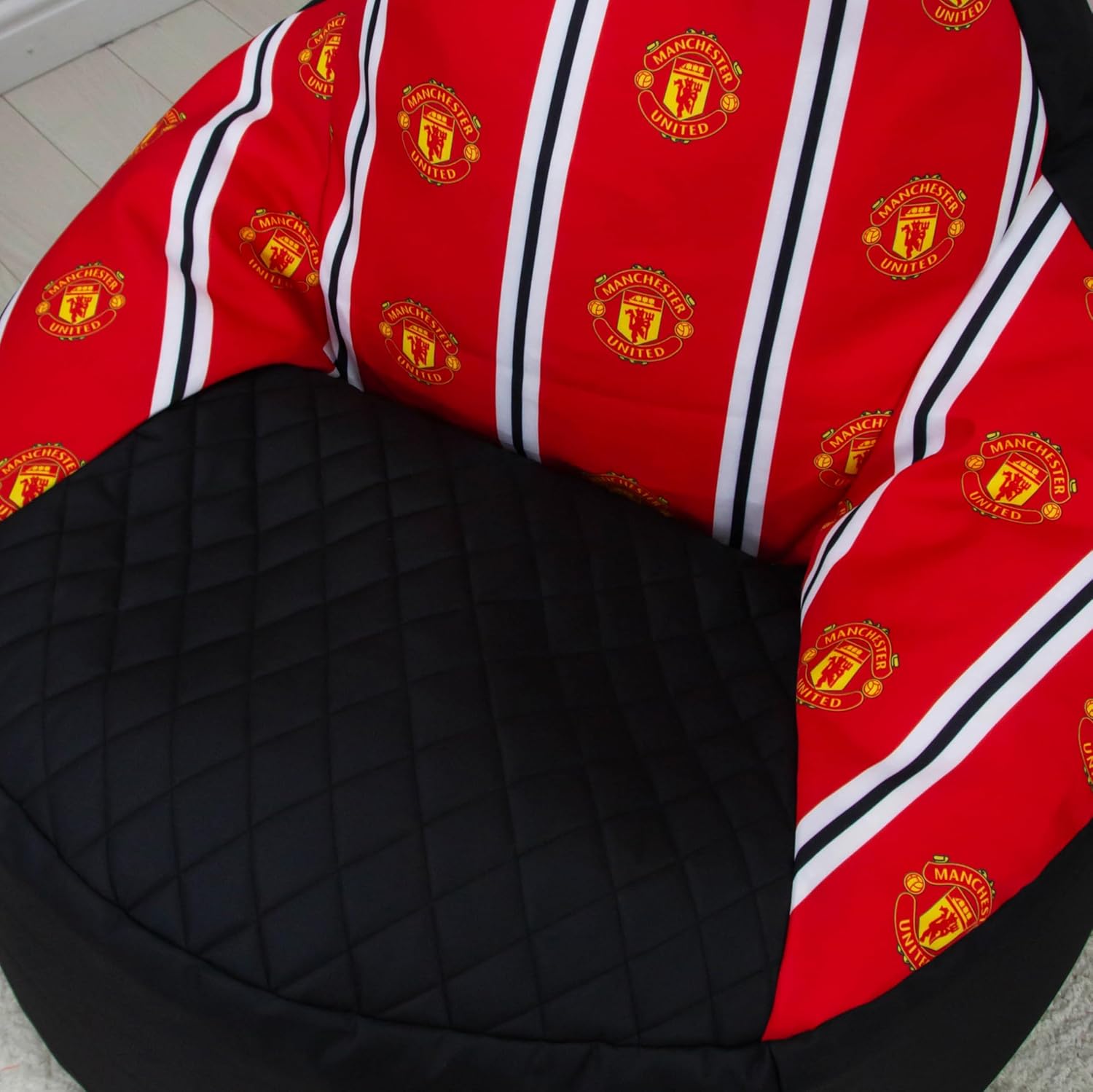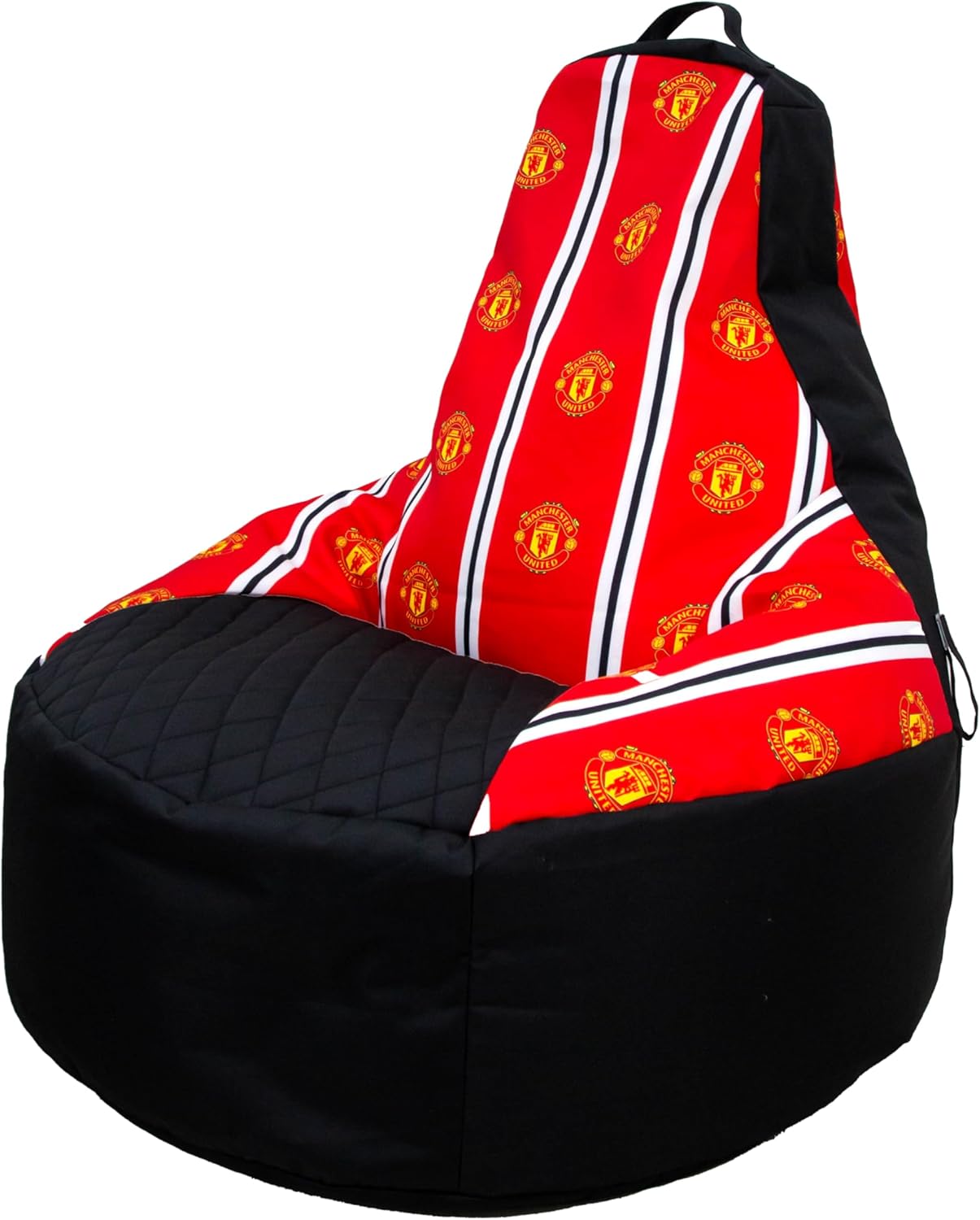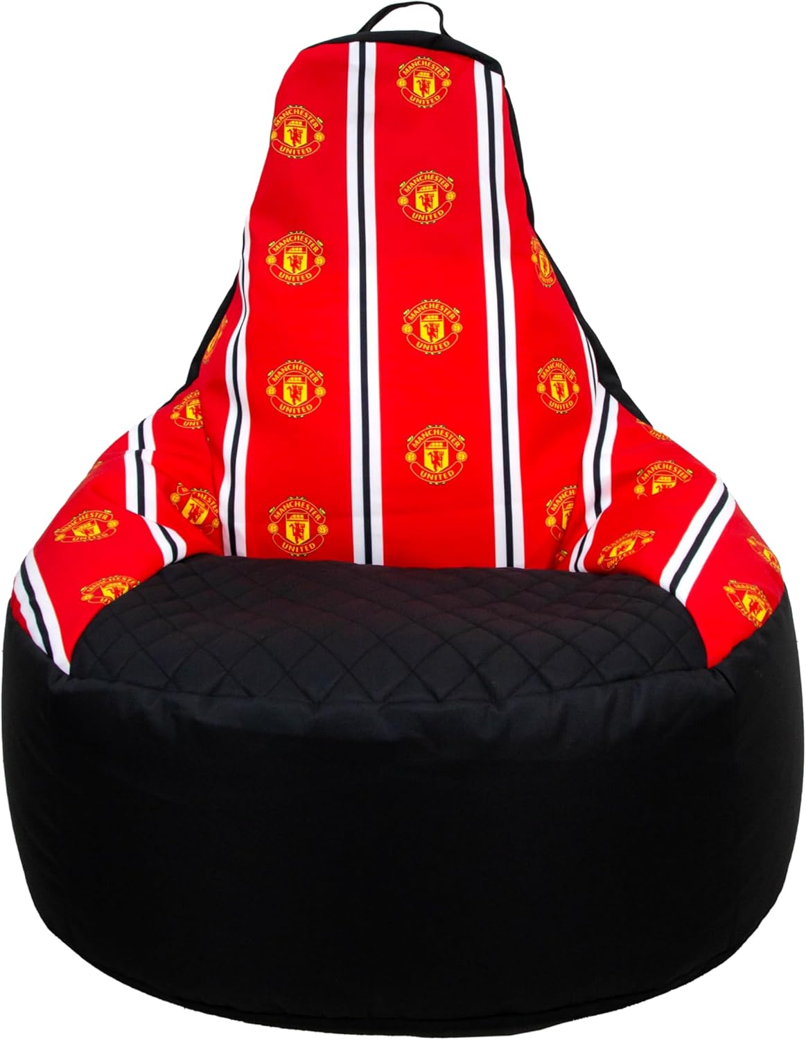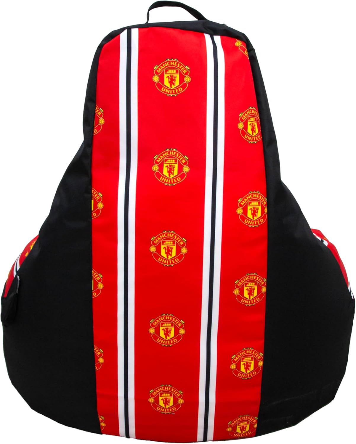 OFFICIALLY LICENSED: Officially licensed by Manchester United, this comfy bean chair is black and perfect for gamers, featuring stripes of red, white and black with the Man United club badge running from the headrest to the seat, with the same band of red, white and black with the club crest running down the reverse side