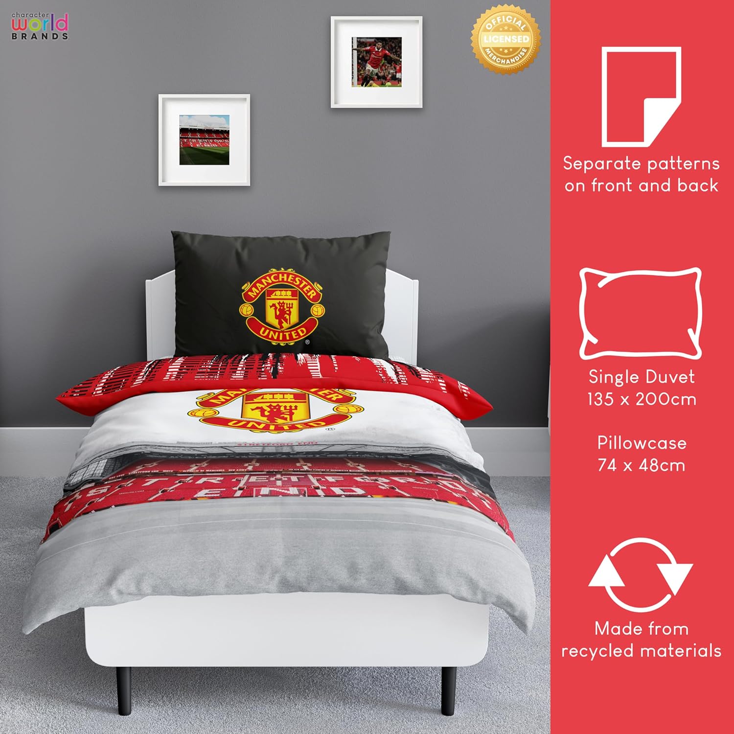 Manchester United FC Official Single Duvet Cover Set, Theatre Design | Red Reversible 2 Sided Football Stadium Bedding Cover Official Merchandise Including Matching Pillow Case