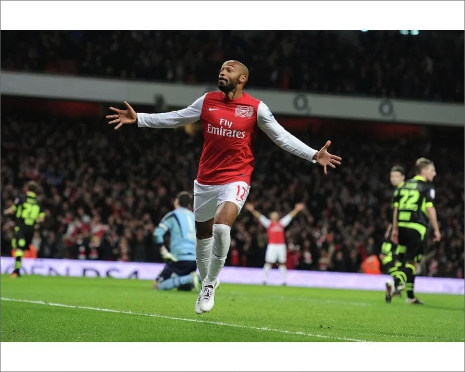 Print depicting LONDON, ENGLAND – JANUARY 09: Thierry Henry celebrates scoring the Arsenal goal during the FA Cup Third Round match between Arsenal and Leeds United at Emirates Stadium on January 9, 2012 in London, England. (Photo by Stuart MacFarlane/Arsenal FC via Getty Images). Printed on fade resistant 234gsm Fujifilm Crystal Archive DP II archive quality paper for unrivalled stable artwork permanence and brilliant colour reproduction with smooth tones. 10×8 for landscape images, 8×10 for portrait images. Not for commercial re-sale, publication or reproduction, digitally or otherwise. Copyright 2012 The Arsenal Football Club Plc.