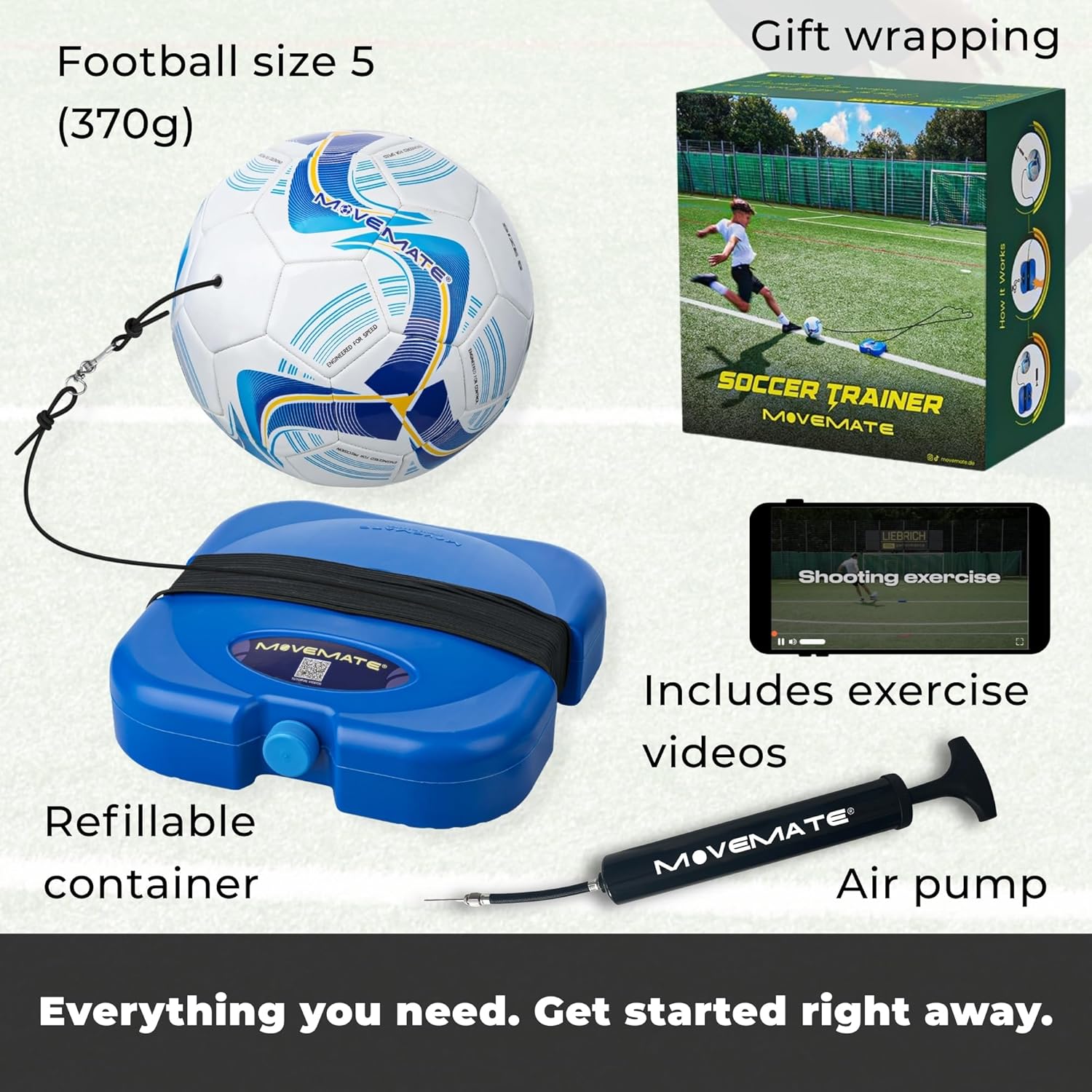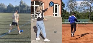 HIGH-QUALITY MATERIAL – To give you the best possible football experience, we use high-quality PU outer material and a durable butyl bladder. In addition, a sturdy 10-metre rope is integrated directly into the surface of the ball so that it does not tear even when hit hard. The handy water-fillable container completes the set and remains stable during all types of shots.