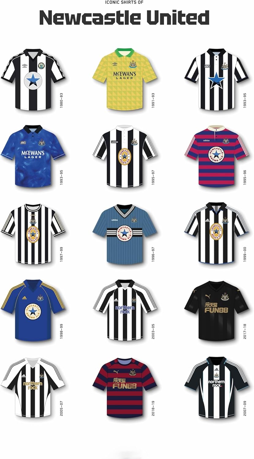 HISTORICAL COLLECTION: Showcases the evolution of Newcastle United kits, from classic black and white stripes to distinctive away designs, including notable sponsor partnerships