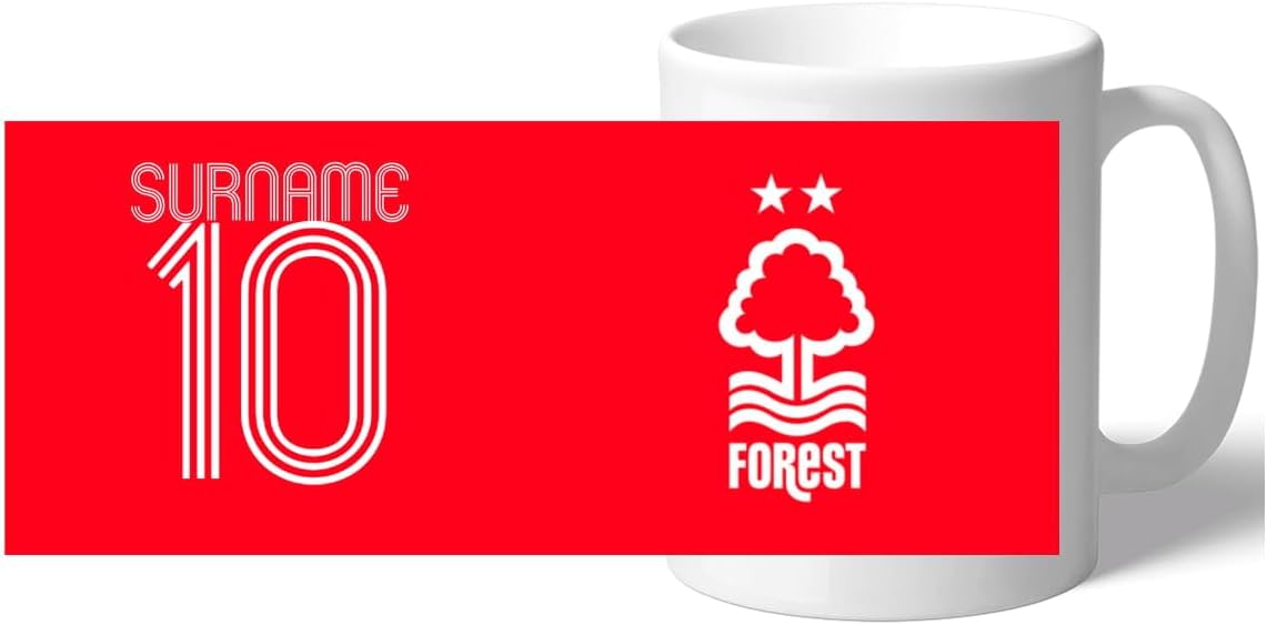 This mug intended for Nottingham Forest FC fans can be personalised with a name up to 12 characters and number up to 2 digits in retro style font.