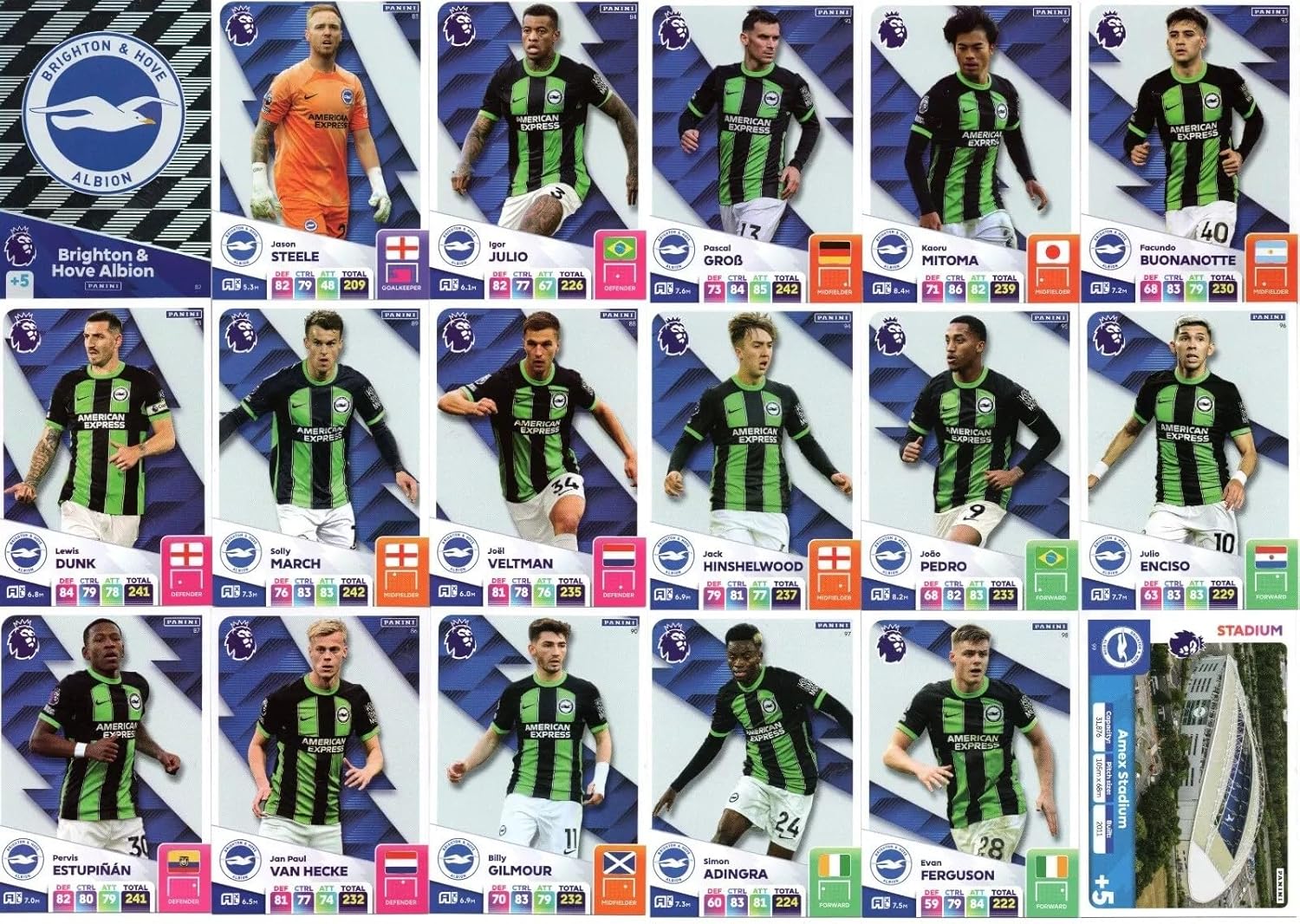 This listing is for a Panini Premier League 2024 2025 Brighton Base Team Cards. All 18 cards included. 82. Team Badge (Brighton) 83. Jason Steele (Brighton) 84. Igor Julio (Brighton) 85. Lewis Dunk (Brighton) 86. Jan Paul van Hecke (Brighton) 87. Pervis Estupiñán (Brighton) 88. Joel Veltman (Brighton) 89. Solly March (Brighton) 90. Billy Gilmour (Brighton) 91. Pascal Gross (Brighton) 92. Kaoru Mitoma (Brighton) 93. Facundo Buonanotte (Brighton) 94. Jack Hinshelwood (Brighton) 95. João Pedro (Brighton) 96. Julio Enciso (Brighton) 97. Simon Adingra (Brighton) 98. Evan Ferguson (Brighton) 99. Amex Stadium (Brighton)