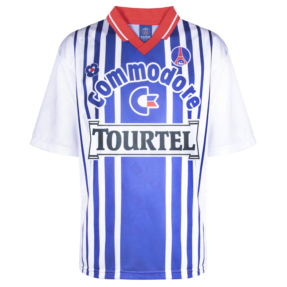 Paris St Germain 1993 Away Retro Football Shirt Worn in the 1994 season, the away shirt was used in the successful defence of the French Ligue 1, the squad included the likes of David Ginola, George Weah and Bruno Germain.
