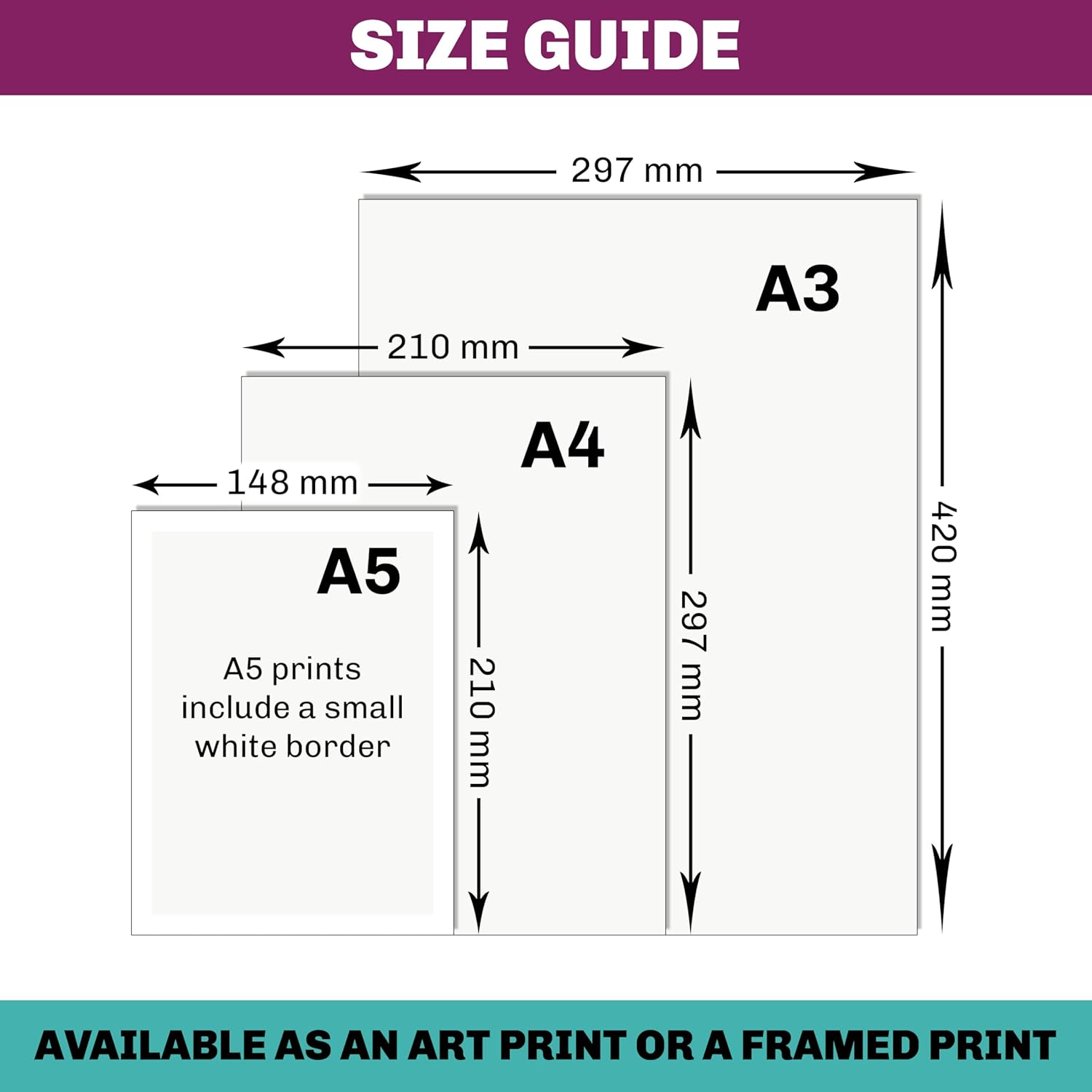 Print Sizes: A5, A4, A3. Choose to order unframed or with a frame. Frames are made using the finest Italian hardwoods and are hand-pinned by craftsman. Our dedication to quality ensures that our frames are not only beautiful but also built to last.