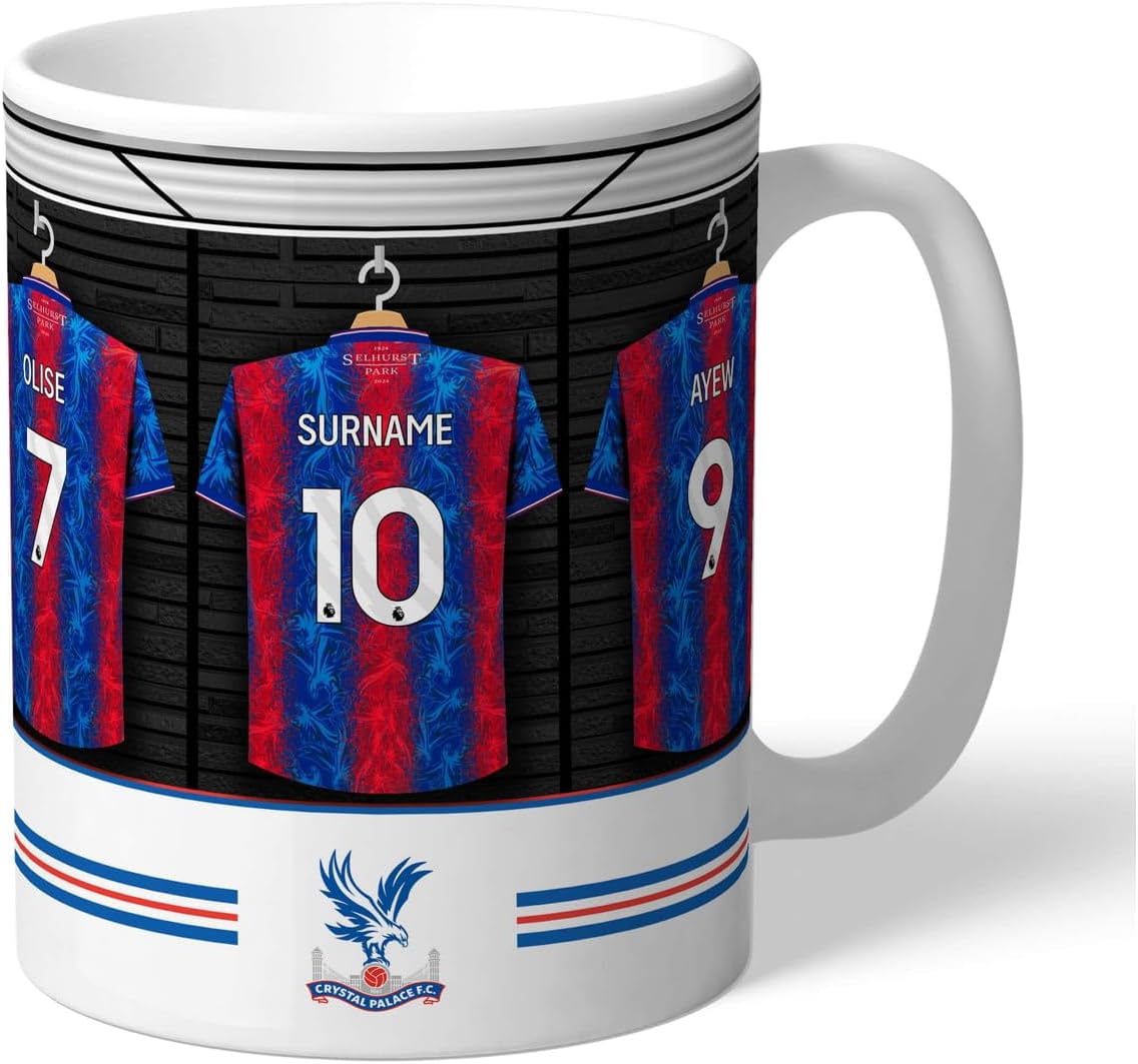 This mug for Crystal Palace FC fans features dressing room team shirts, personalise the centre shirt with a name up to 12 characters and shirt number (1-99 only) matching those of the other players.