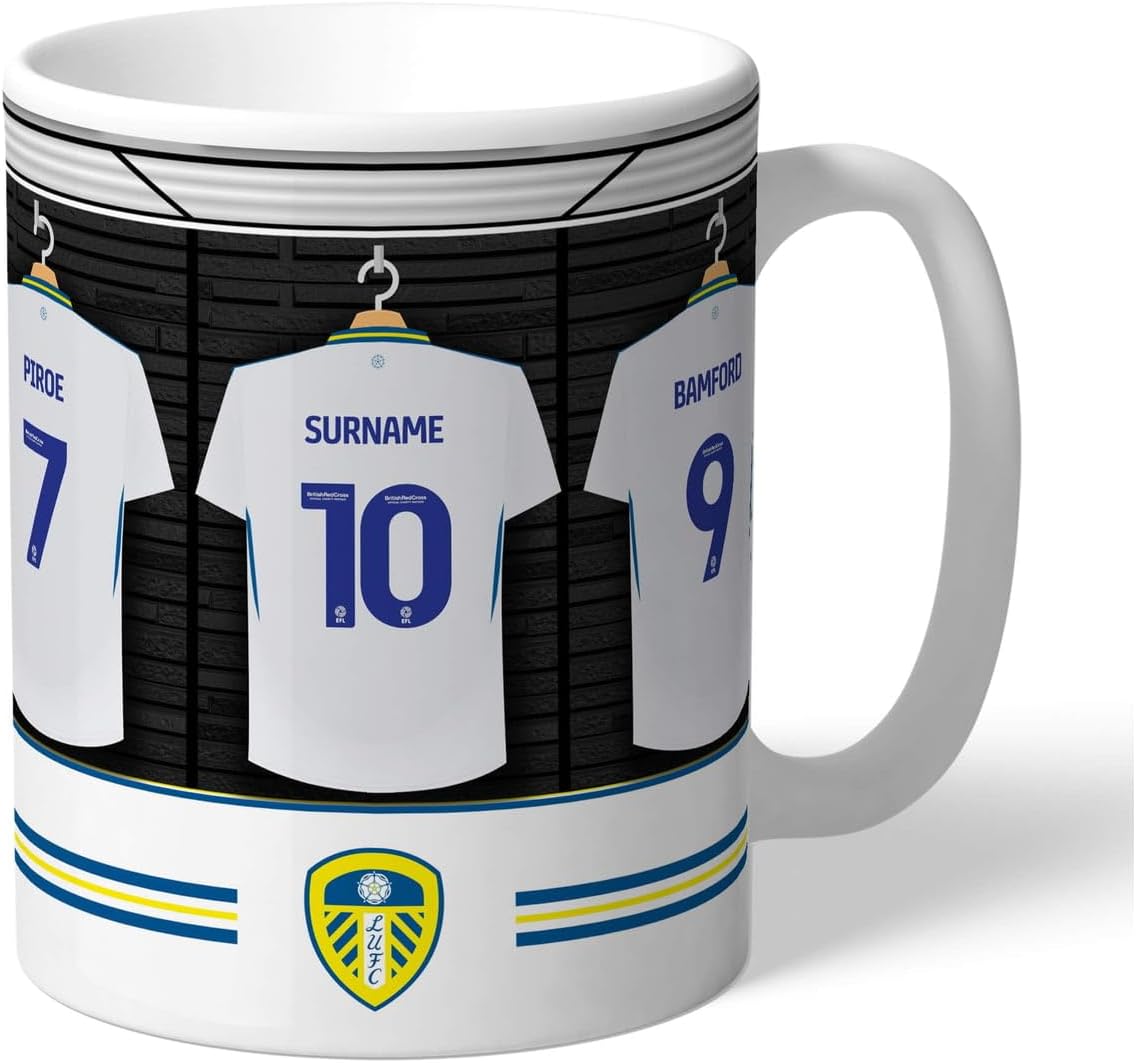 This mug for Leeds United FC fans features dressing room team shirts, personalise the centre shirt with a name up to 12 characters and shirt number (1-99 only) matching those of the other players.