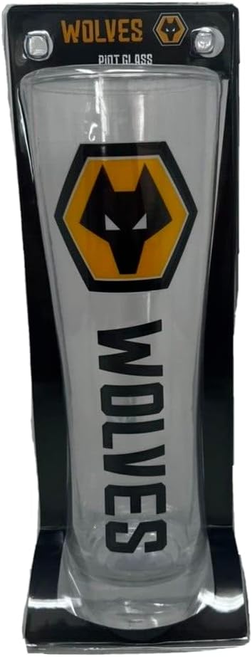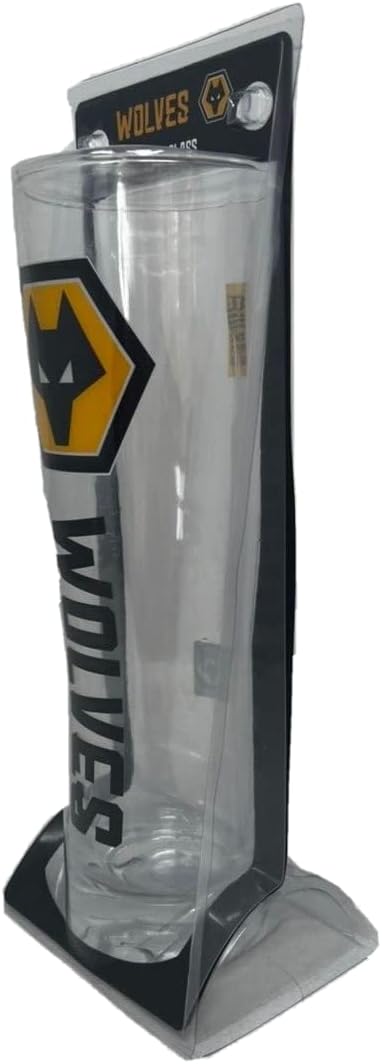 Official Wolverhampton Wolves FC Peroni style tall pint glass Glass features large full color club crest Wolverhampton Wolves branded acetate packaging Top quality glass; perfect gift item This is the latest design of the Wolverhampton Wolves Glass and it is Approx: 24cm tall. Officially licensed product and ideal for a gift.