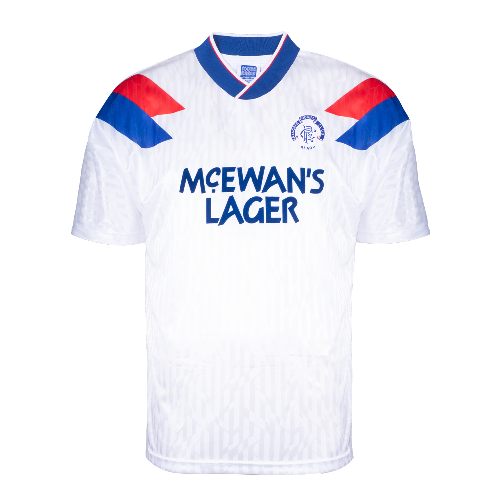 Rangers 1990 Away Retro Football Shirt Replica away retro shirt for Rangers FC from early 1990s. Shirt popular with one of the most successful periods for the club. Features sublimated pattern design with McEwans sponsor. 100% polyester.