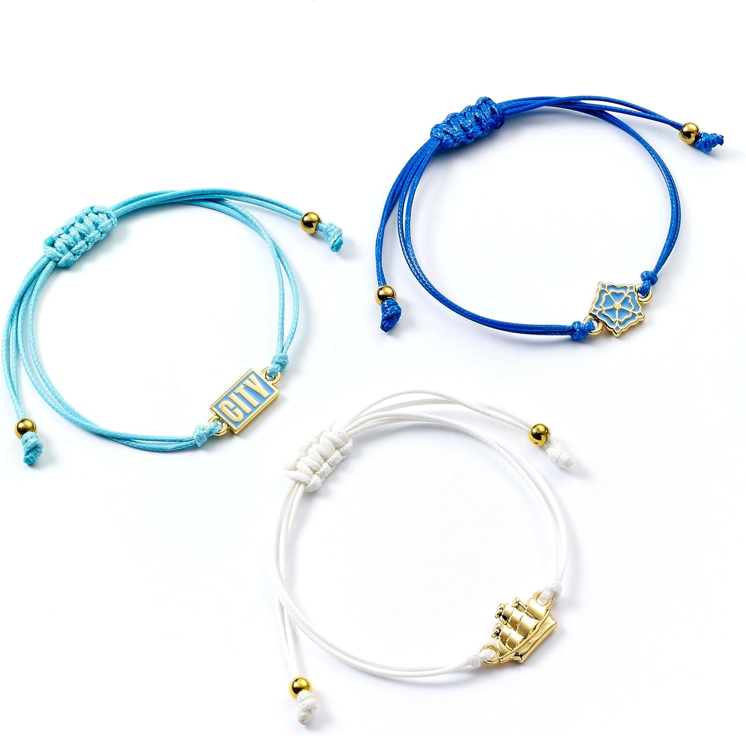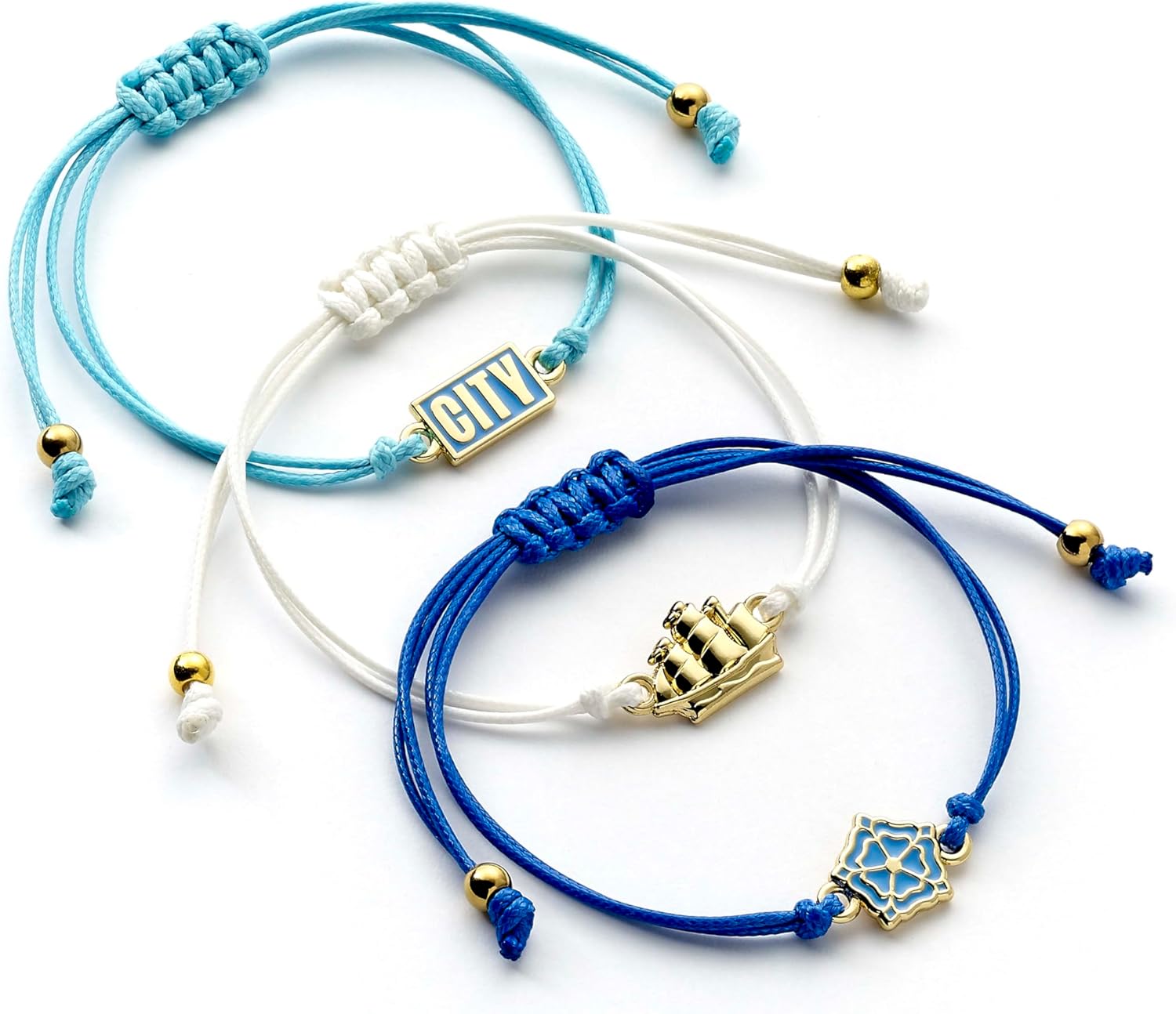 Show your team spirit with these officially licensed Manchester City FC friendship bracelets! Perfect for ages 14 and up, the three adjustable cord bracelets come with the team’s emblem and can be stacked or swapped with friends. Hypoallergenic charms. Adjustable cord, measuring from 15cm to 18cm, so they’ll fit perfectly on your wrist.
