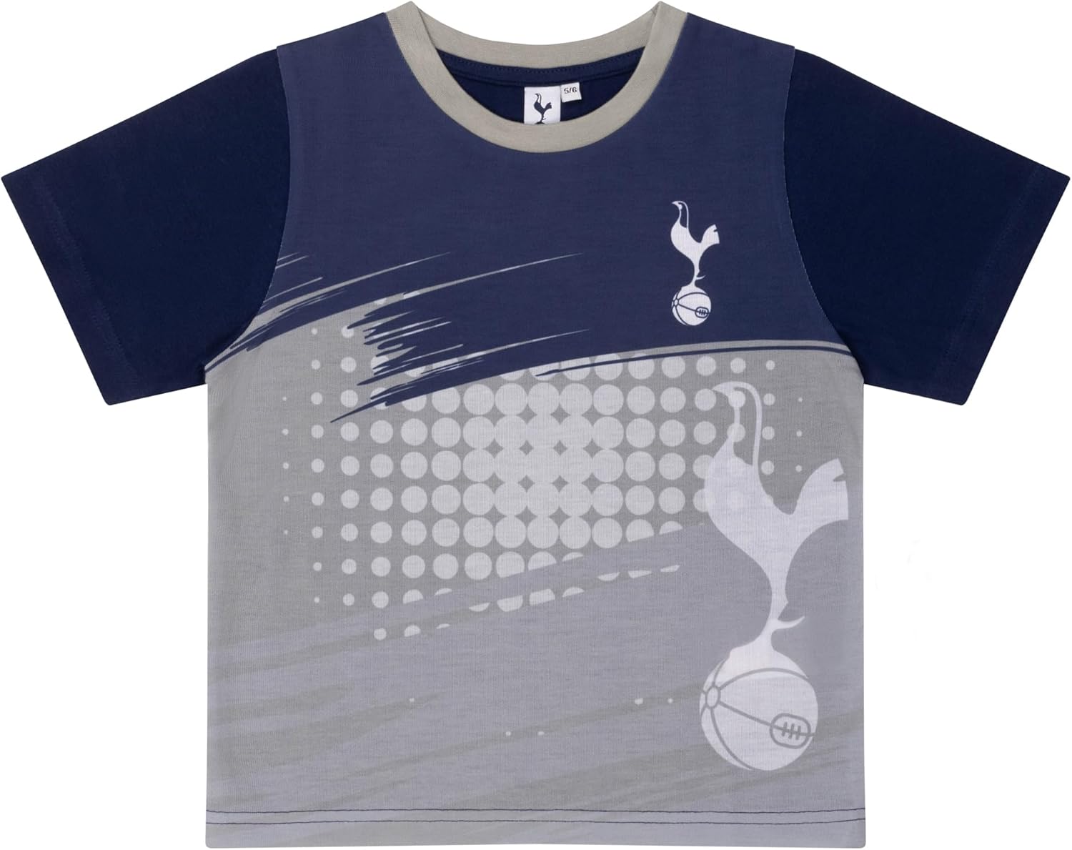 The top features the iconic Tottenham Hotspur cockerel crest on the front, set against a modern grey and navy design with a dynamic background.
