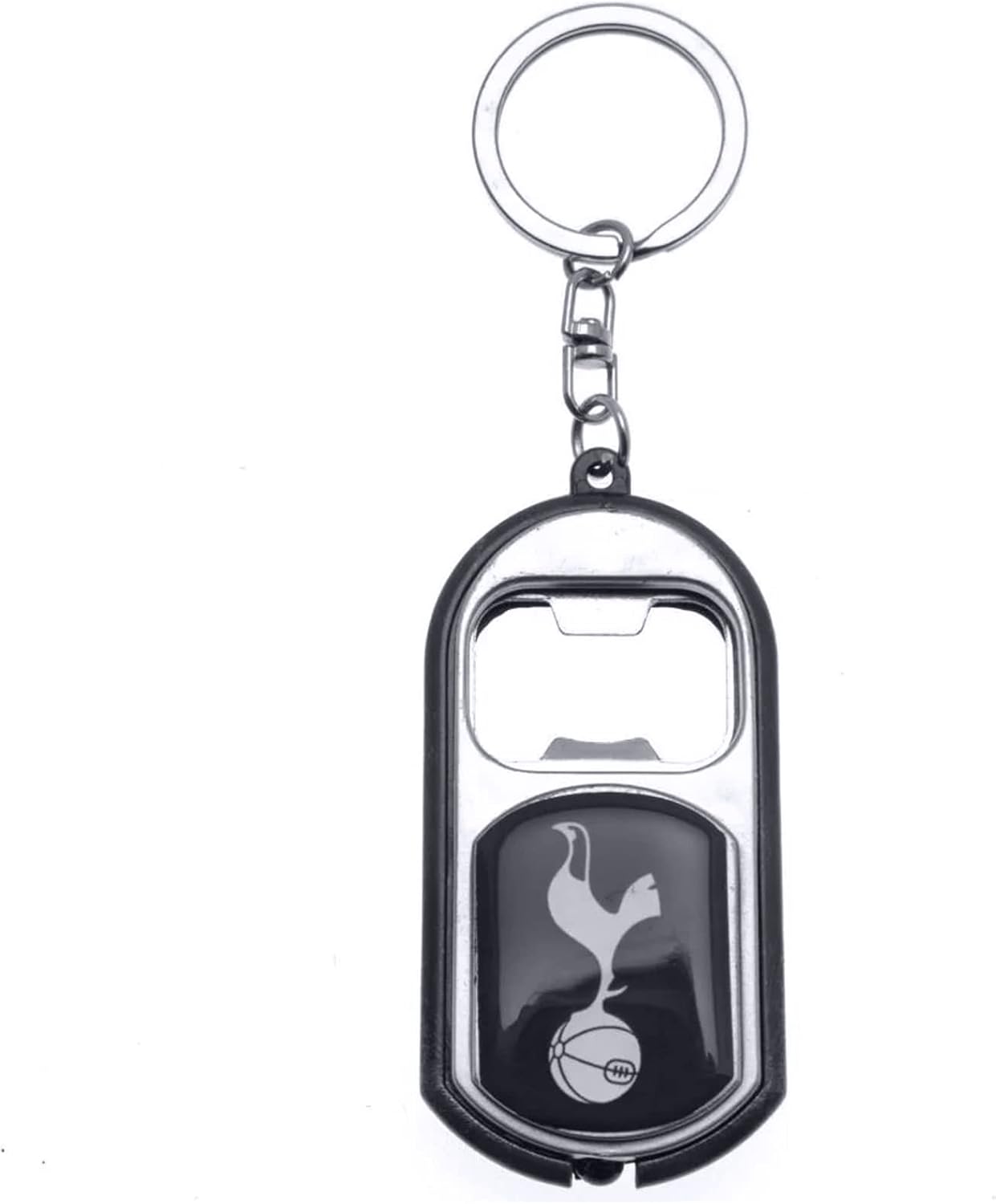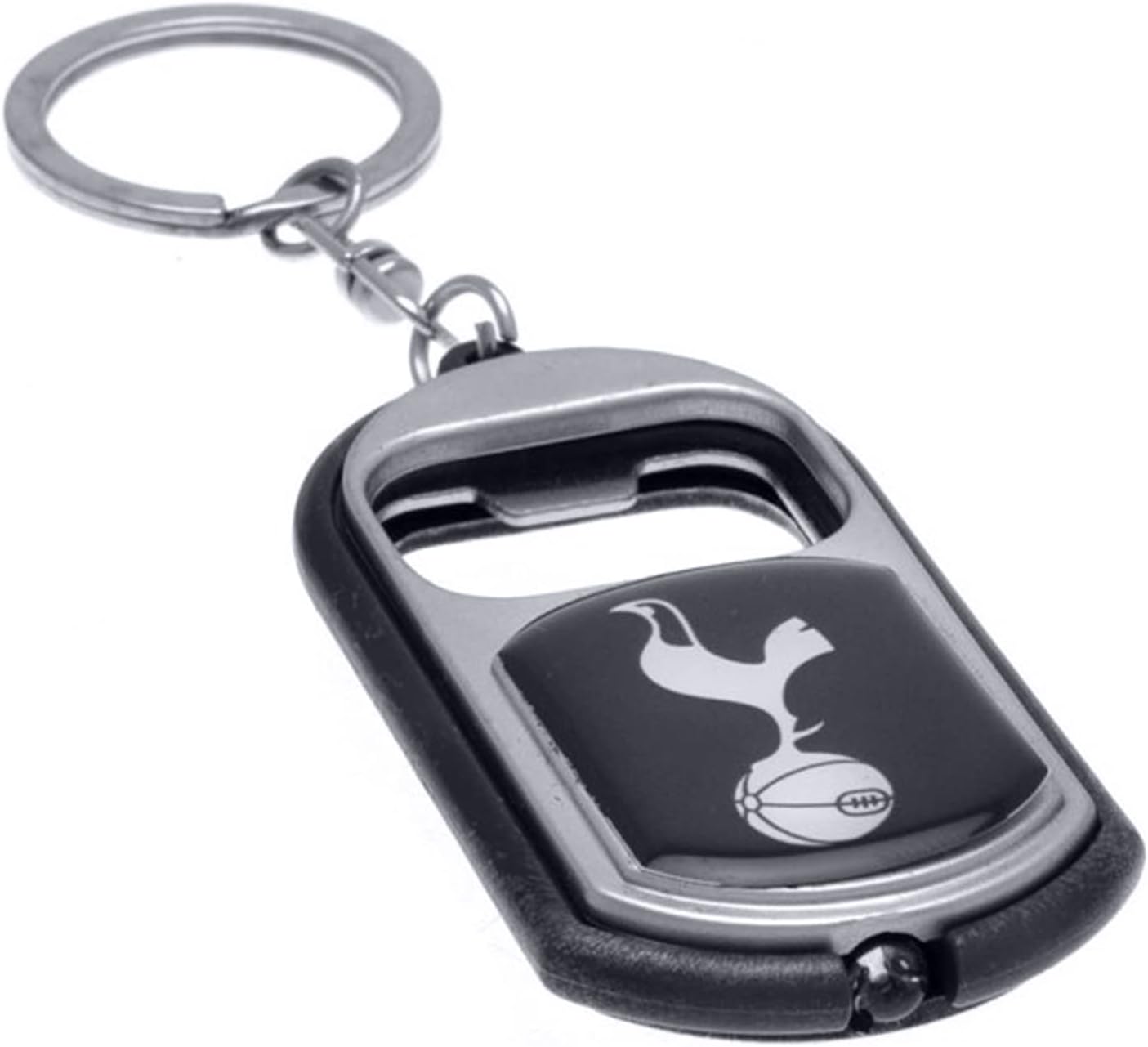 Bottle opener keyring with built in torch and Tottenham Hotspur FC branding. Split ring and chain link to easily affix to your keys. Comes in a black gift box. The Tottenham Hotspur FC Bottle Opener Keyring is an official product manufactured under license for Tottenham Hotspur Football Club.