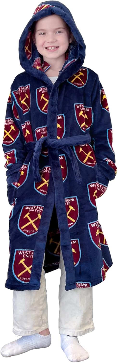 West Ham United FC Boys Dressing Gown Robe Hooded Fleece Kids OFFICIAL Football