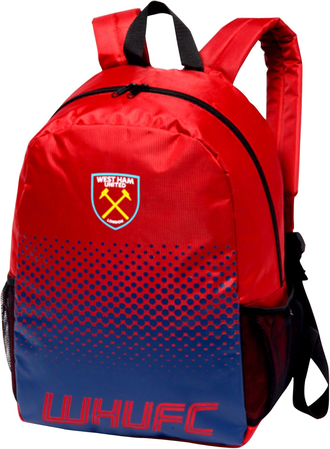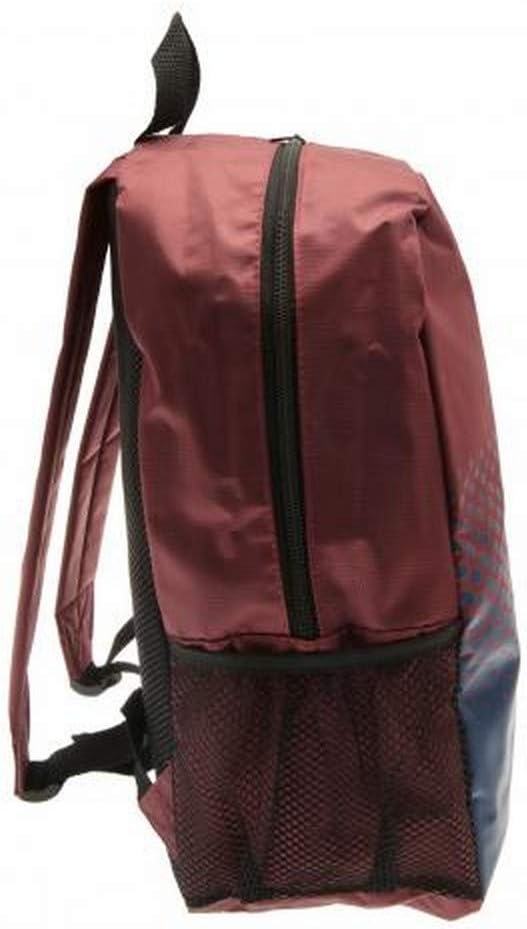 Backpack with West Ham FC branding. Printed club crest WHUFC text design. Mesh side pockets. Adjustable shoulder straps. 100% Polyester. This is an official licensed product.