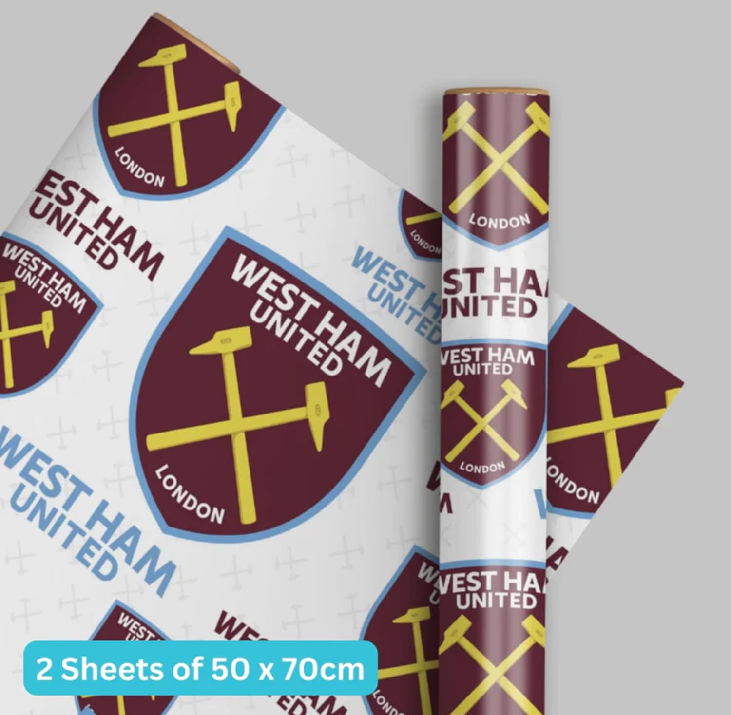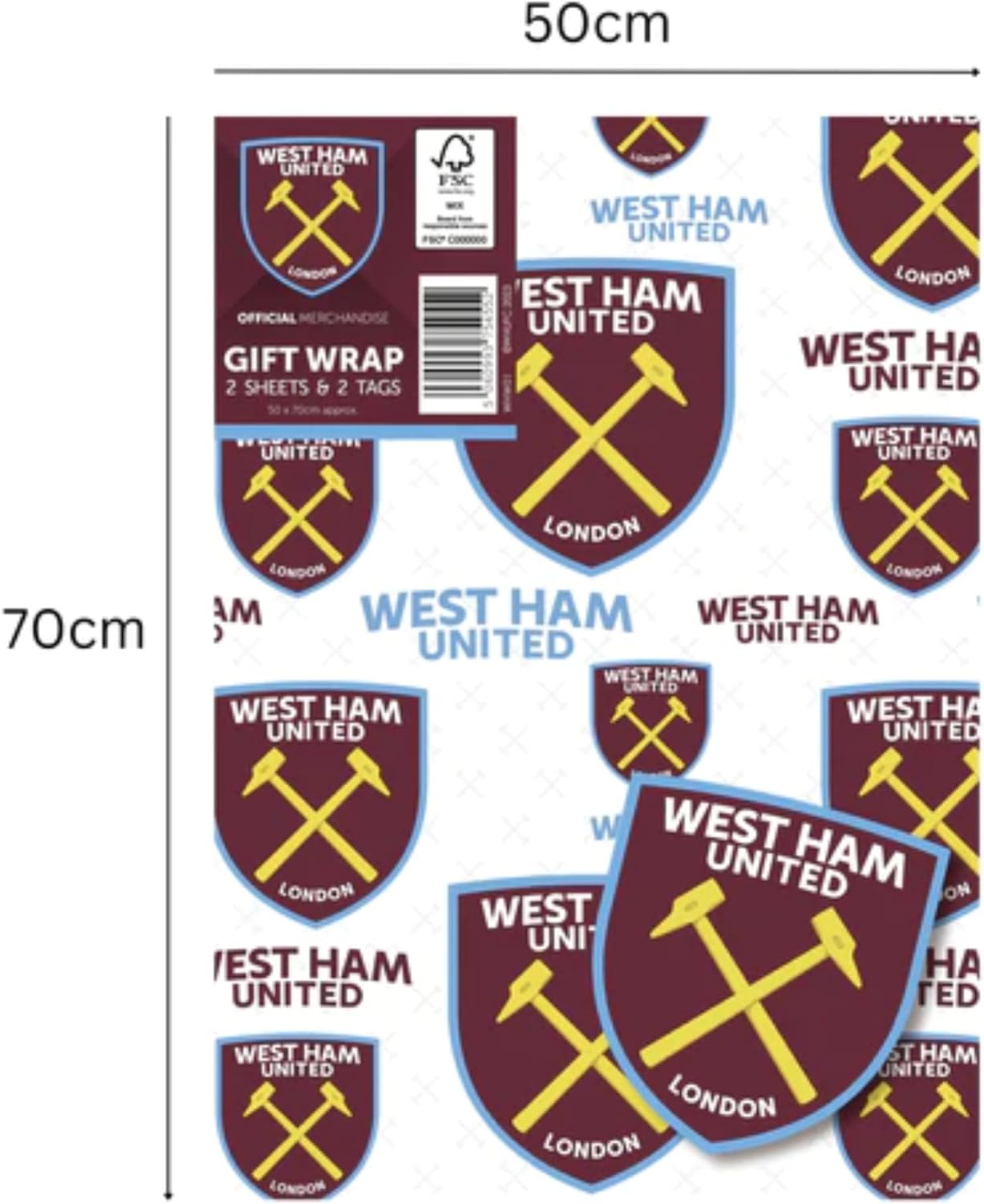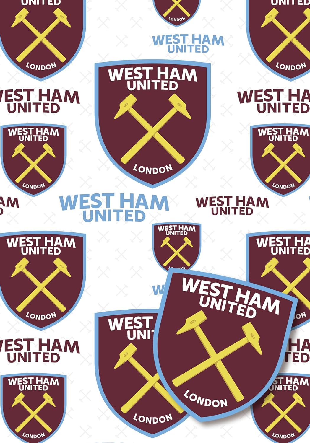 This pack of two sheets of gift wrap has the West Ham Football Club Crest repeated across it in various sizes. West Ham United is also written across the light background. This gift wrap is great for a birthday present but will also suit any occasion for a WHUFC fan. Pack contains two 70 x 50cm sheets and two tags for message writing.