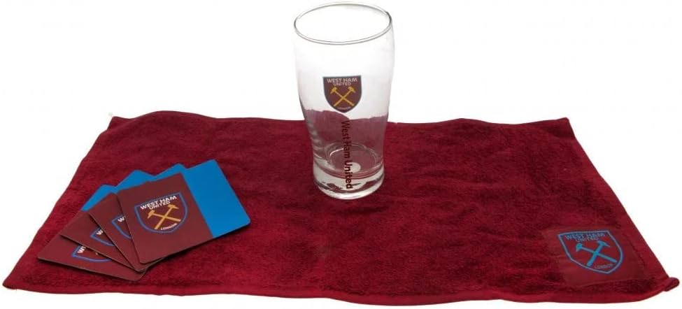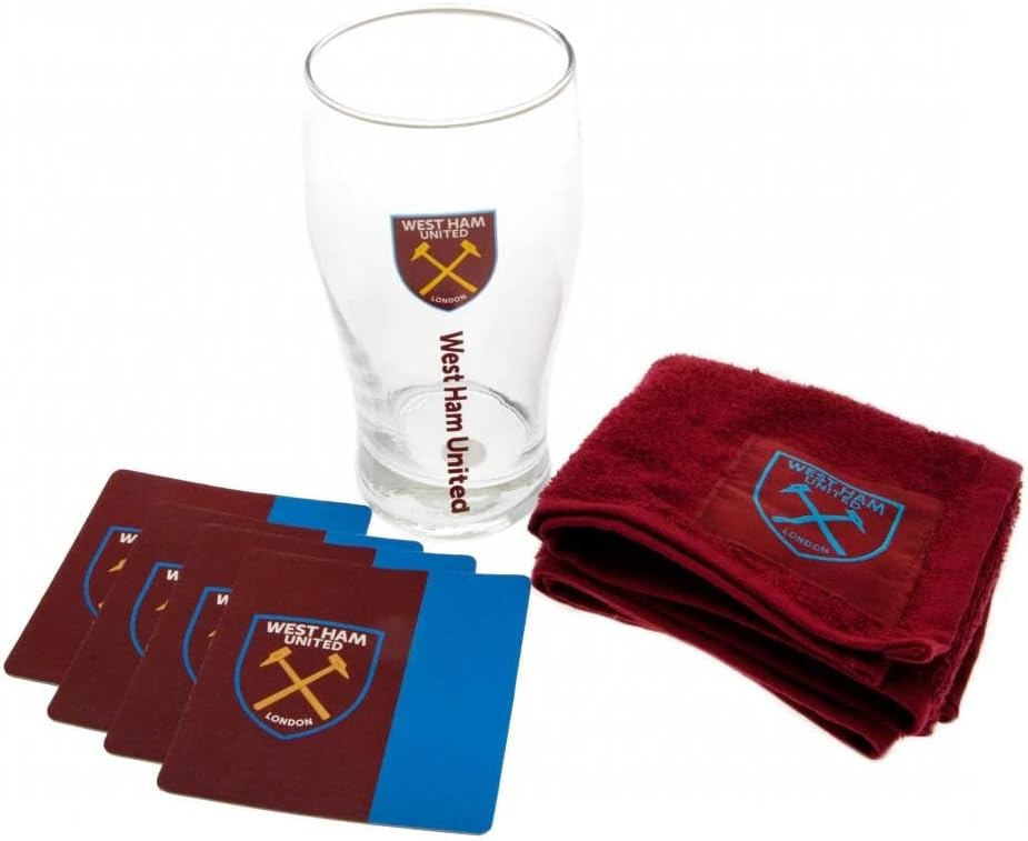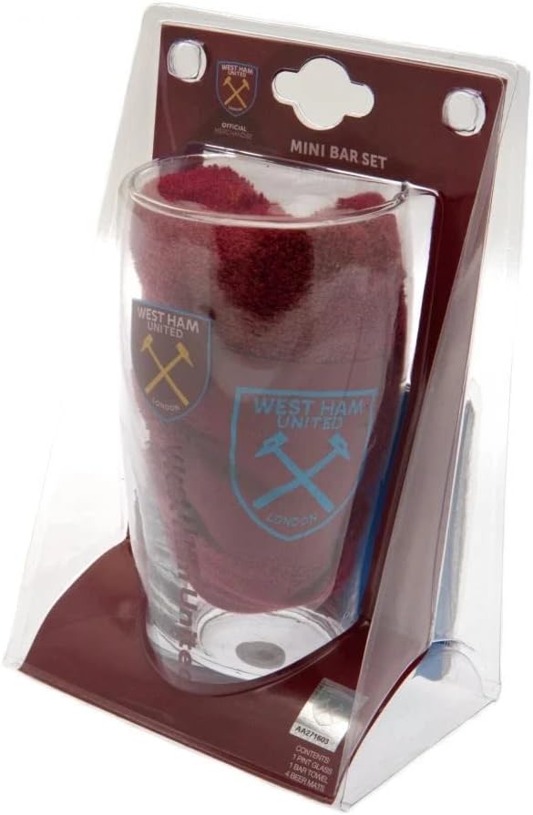 West Ham United F.C. Mini Bar Set mini bar set 1 x pint glass 4 x beer mats 1 x beer towel in a blister pack official licensed product Weight in grams : 513.00 Licensed rights passed from Taylors Football Souvenirs