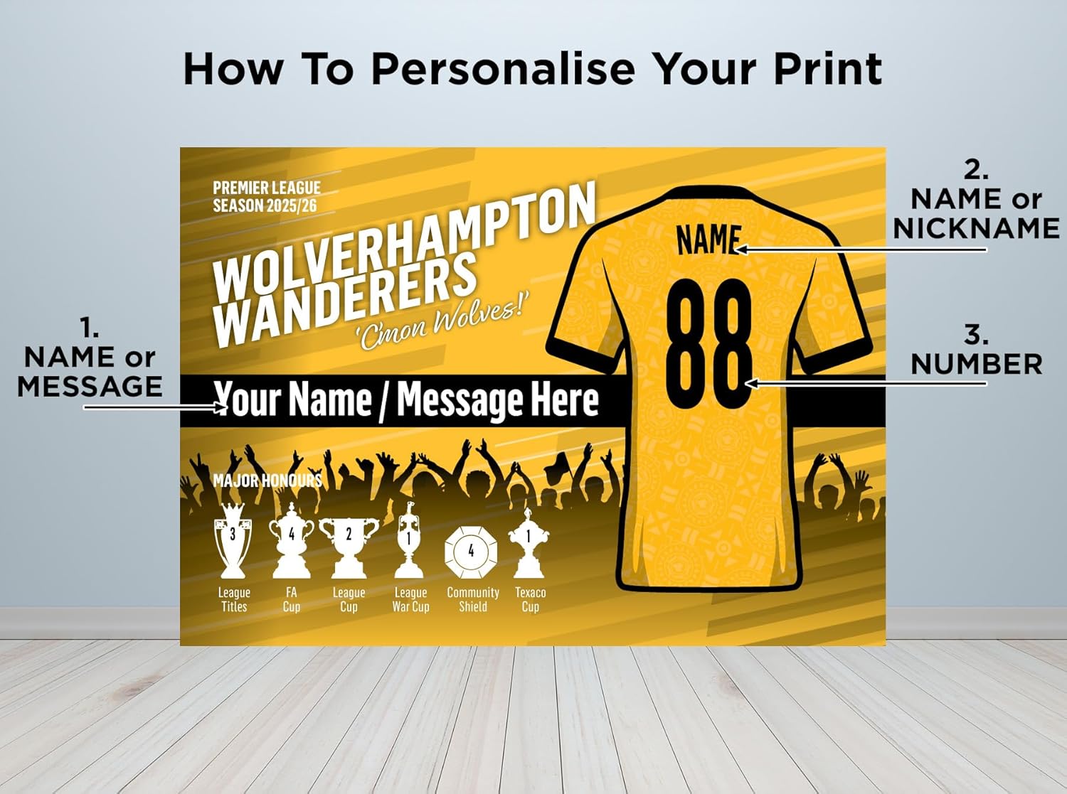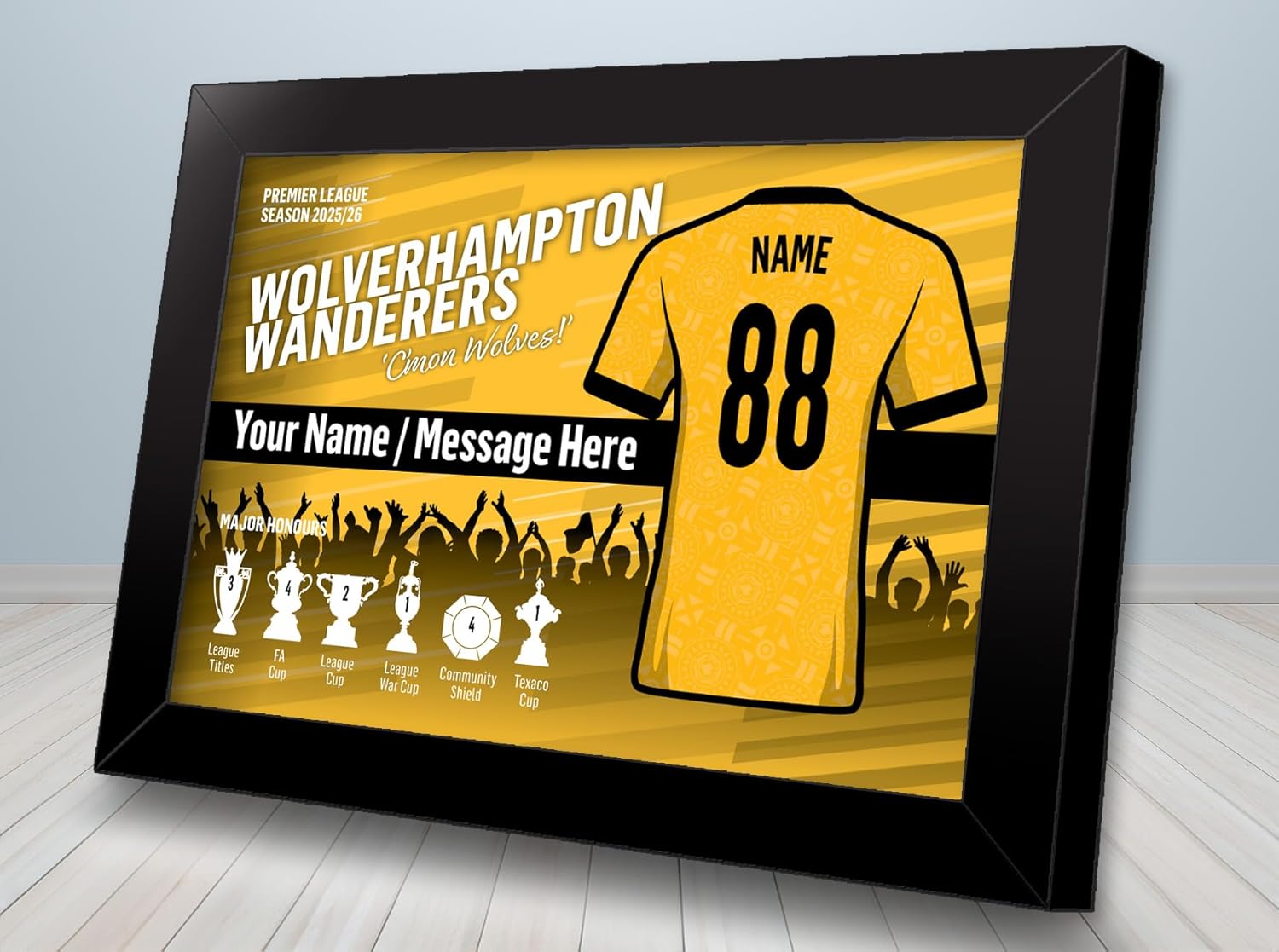 Our Personalised Wolverhampton Wanderers Football Club Team Prints are created on demand. This means we design and print using the current WWFC colours and showing their latest team shirts – all with your preferred details.