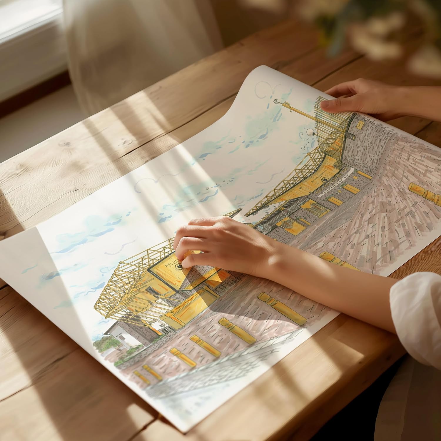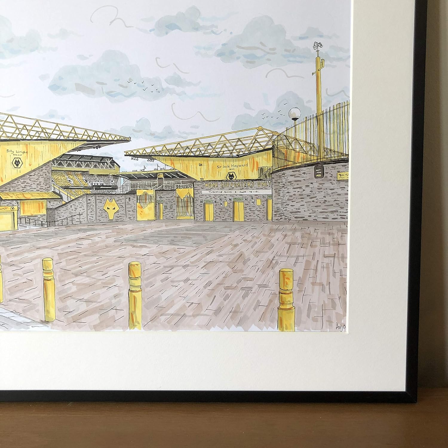 Hand-drawn print of Wolverhampton Wanderers, Molineux Stadium. A wonderful addition to your home or a thoughtful gift for any Wolves fan! Sketched in pencils and finished with fine liner pens and pro marker pens.