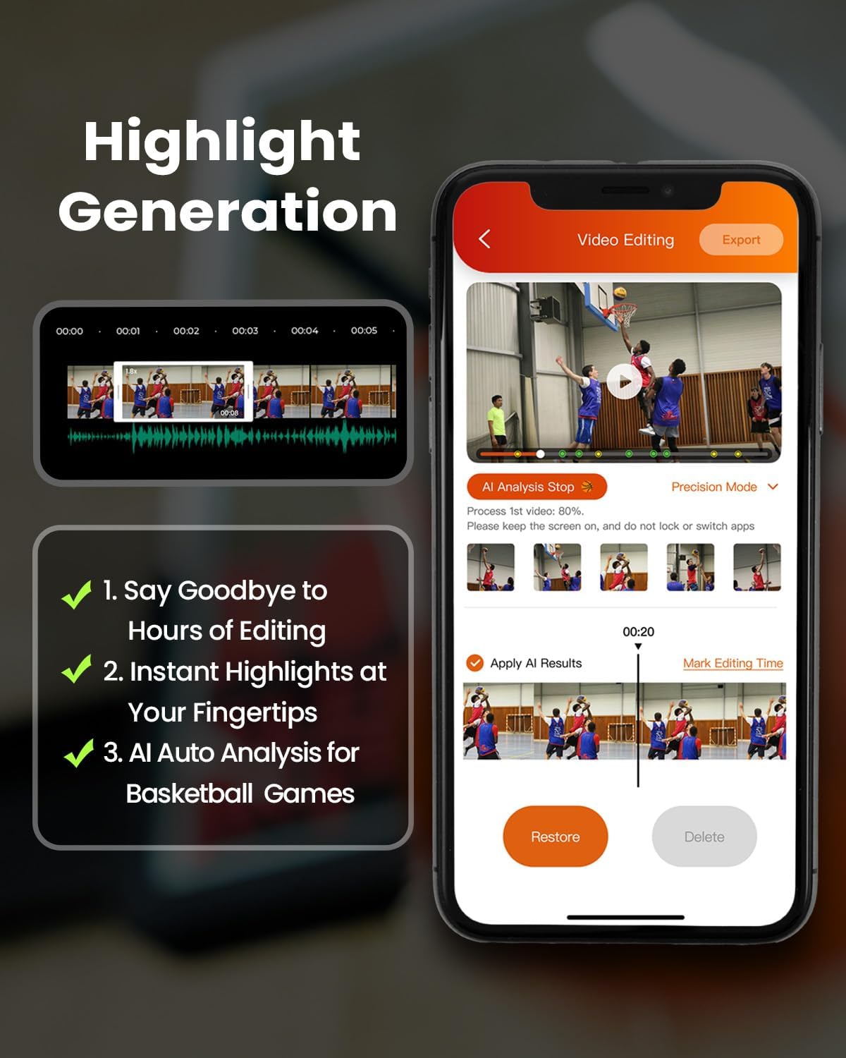 Capture Freely, Pay Nothing Extra: Easily capture key moments using the Bluetooth remote or Apple Watch, and create highlight reels with a single tap. Stay on top of the action with the live scoreboard feature, keeping track of scores in real time. Enjoy 20GB of free cloud storage to securely save your footage, free up your phone’s memory, and access your videos anytime, no subscriptions fee.